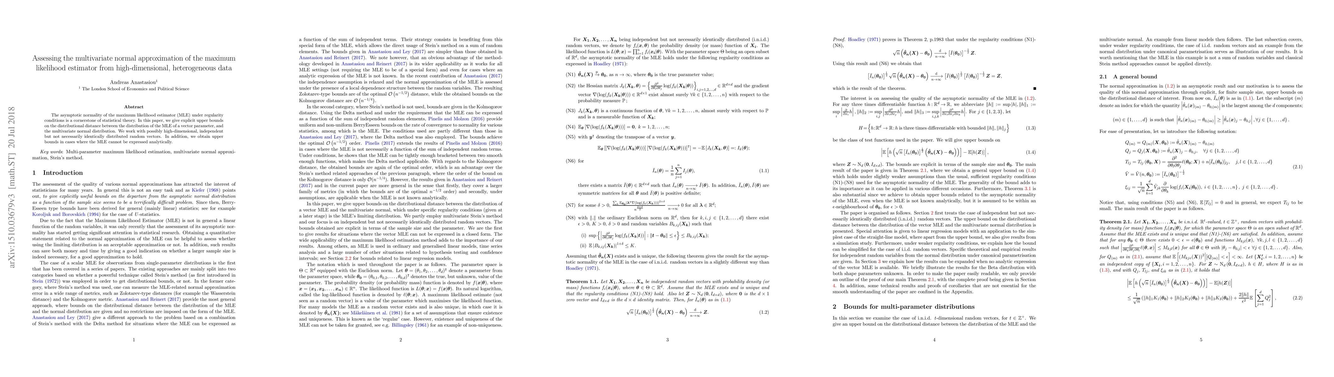 This paper provides explicit upper bounds on the distributional distance between the maximum likelihood estimator (MLE) and the multivariate normal distribution for high-dimensional, independent but heterogeneous data, even when the MLE cannot be expressed analytically. It challenges the traditional assumptions of identical distribution and offers a robust approach to assessing the MLE's asymptotic normality.