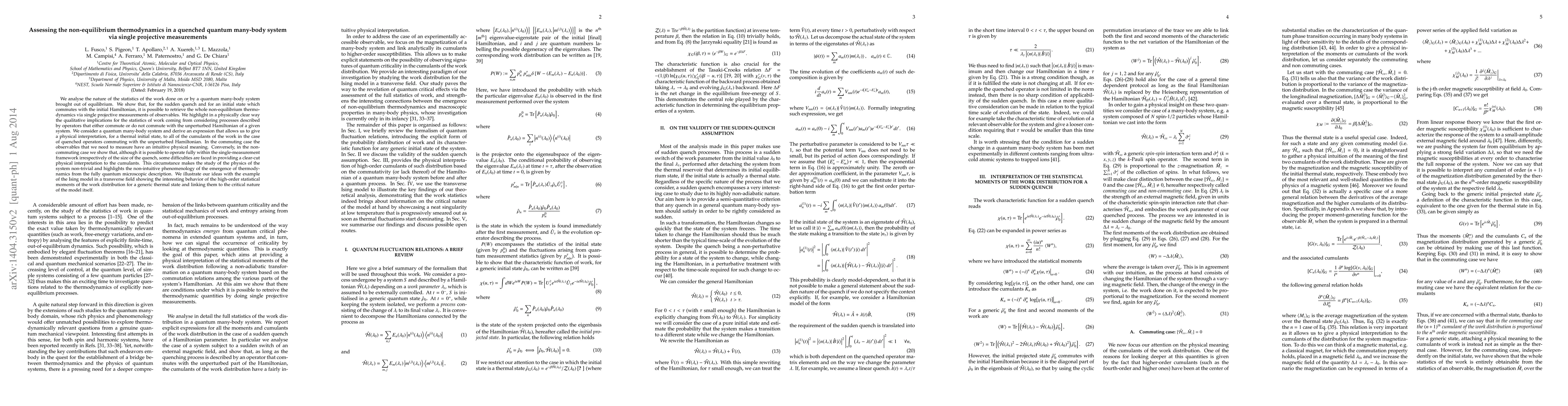 We analyse the nature of the statistics of the work done on or by a quantum many-body system brought out of equilibrium. We show that, for the sudden quench and for an initial state which commutes with the initial Hamiltonian, it is possible to retrieve the whole non-equilibrium thermodynamics via single projective measurements of observables. We highlight in a physically clear way the qualitative implications for the statistics of work coming from considering processes described by operators that either commute or do not commute with the unperturbed Hamiltonian of a given system. We consider a quantum many-body system and derive an expression that allows us to give a physical interpretation, for a thermal initial state, to all of the cumulants of the work in the case of quenched operators commuting with the unperturbed Hamiltonian. In the commuting case the observables that we need to measure have an intuitive physical meaning. Conversely, in the non-commuting case we show that, although it is possible to operate fully within the single-measurement framework irrespectively of the size of the quench, some difficulties are faced in providing a clear-cut physical interpretation to the cumulants. This circumstance makes the study of the physics of the system non-trivial and highlights the non-intuitive phenomenology of the emergence of thermodynamics from the fully quantum microscopic description. We illustrate our ideas with the example of the Ising model in a transverse field showing the interesting behaviour of the high-order statistical moments of the work distribution for a generic thermal state and linking them to the critical nature of the model itself.