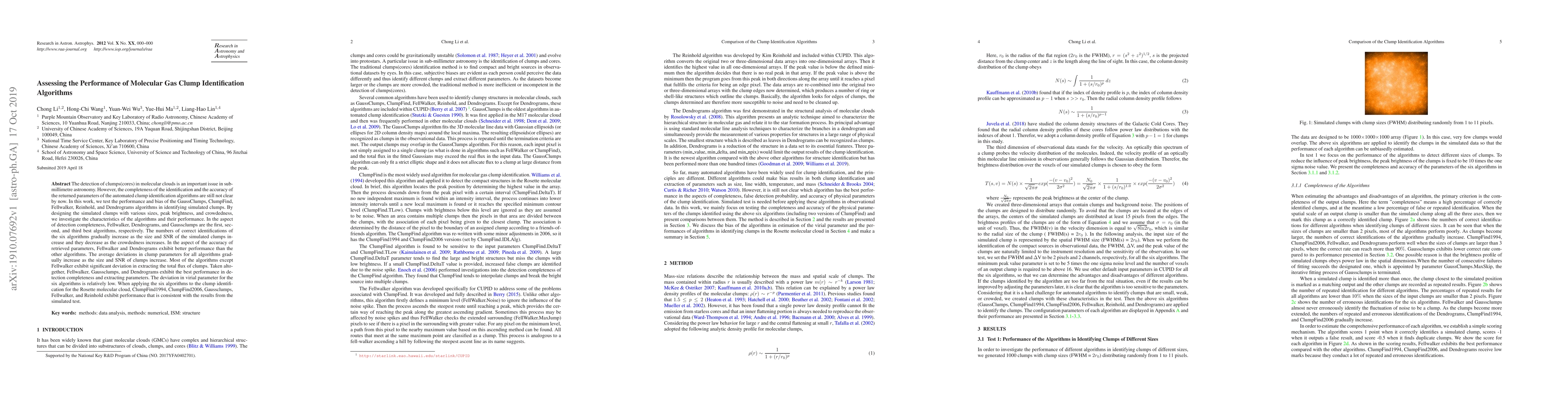 A study evaluates the performance of five molecular gas clump identification algorithms in detecting simulated clumps in molecular clouds, finding that Fellwalker, Gaussclumps, and Dendrograms exhibit the best results in detection completeness and extracting parameters.