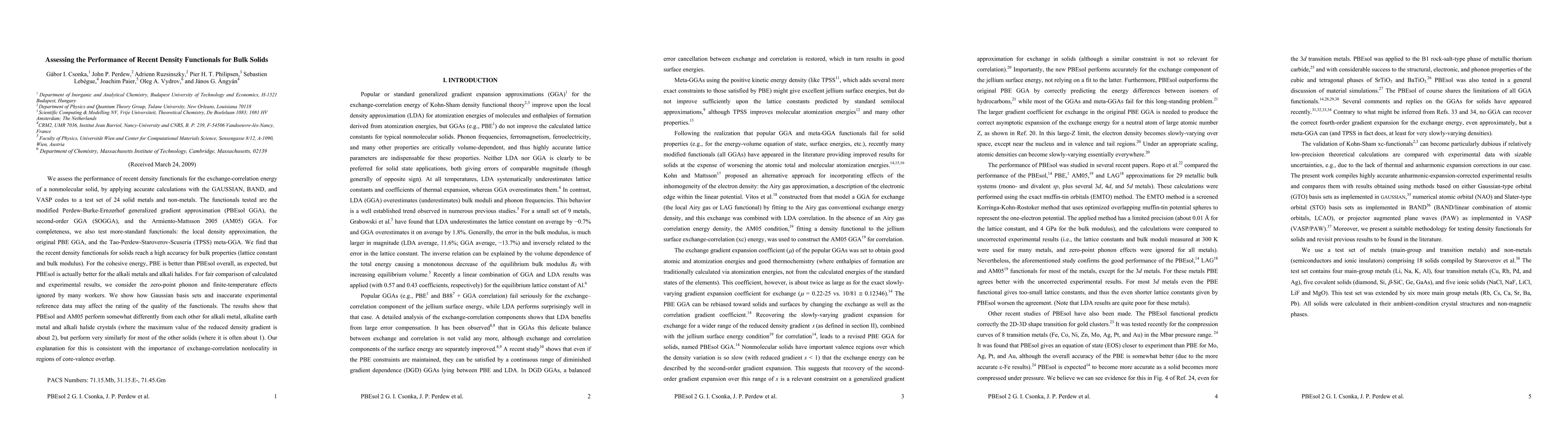 We assess the performance of recent density functionals for the exchange-correlation energy of a nonmolecular solid, by applying accurate calculations with the GAUSSIAN, BAND, and VASP codes to a test set of 24 solid metals and non-metals. The functionals tested are the modified Perdew-Burke-Ernzerhof generalized gradient approximation (PBEsol GGA), the second-order GGA (SOGGA), and the Armiento-Mattsson 2005 (AM05) GGA. For completeness, we also test more-standard functionals: the local density approximation, the original PBE GGA, and the Tao-Perdew-Staroverov-Scuseria (TPSS) meta-GGA. We find that the recent density functionals for solids reach a high accuracy for bulk properties (lattice constant and bulk modulus). For the cohesive energy, PBE is better than PBEsol overall, as expected, but PBEsol is actually better for the alkali metals and alkali halides. For fair comparison of calculated and experimental results, we consider the zero-point phonon and finite-temperature effects ignored by many workers. We show how Gaussian basis sets and inaccurate experimental reference data may affect the rating of the quality of the functionals. The results show that PBEsol and AM05 perform somewhat differently from each other for alkali metal, alkaline earth metal and alkali halide crystals (where the maximum value of the reduced density gradient is about 2), but perform very similarly for most of the other solids (where it is often about 1). Our explanation for this is consistent with the importance of exchange-correlation nonlocality in regions of core-valence overlap.