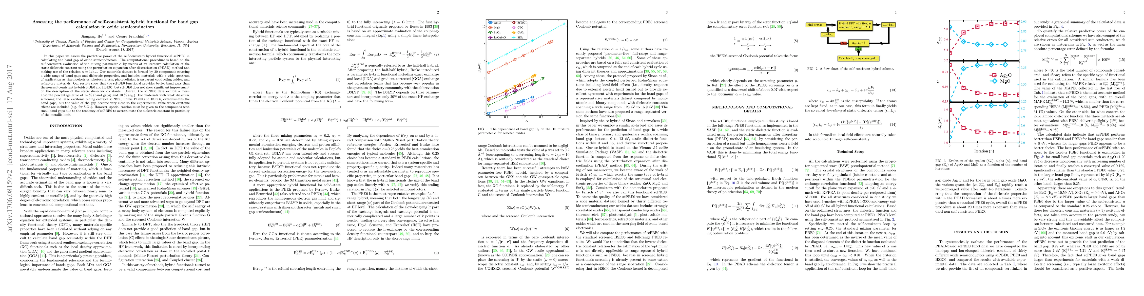 This paper evaluates the self-consistent hybrid functional scPBE0 for calculating band gaps in oxide semiconductors, showing it provides better band gap predictions than PBE0 and HSE06, with a mean absolute percentage error of 14%. However, it tends to overestimate band gaps for materials with weak dielectric screening and large excitonic binding energies, though it aligns closely with experimental values when excitonic effects are considered.
