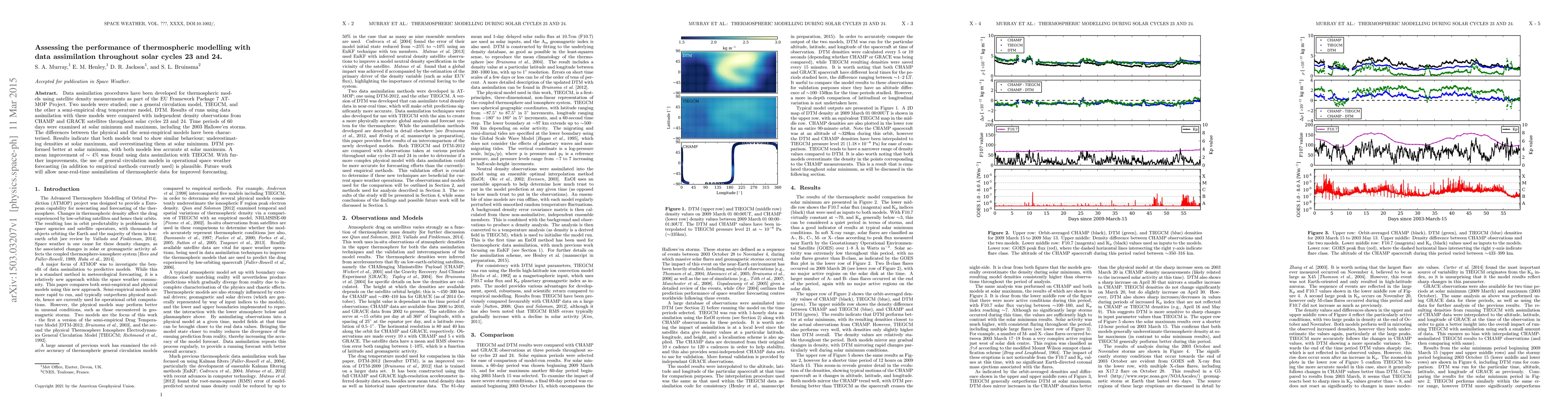 Data assimilation procedures have been developed for thermospheric models using satellite density measurements as part of the EU Framework Package 7 ATMOP Project. Two models were studied; one a general circulation model, TIEGCM, and the other a semi-empirical drag temperature model, DTM. Results of runs using data assimilation with these models were compared with independent density observations from CHAMP and GRACE satellites throughout solar cycles 23 and 24. Time periods of 60 days were examined at solar minimum and maximum, including the 2003 Hallowe'en storms. The differences between the physical and the semi-empirical models have been characterised. Results indicate that both models tend to show similar behaviour; underestimating densities at solar maximum, and overestimating them at solar minimum. DTM performed better at solar minimum, with both models less accurate at solar maximum. A mean improvement of ~4% was found using data assimilation with TIEGCM. With further improvements, the use of general circulation models in operational space weather forecasting (in addition to empirical methods currently used) is plausible. Future work will allow near-real-time assimilation of thermospheric data for improved forecasting.