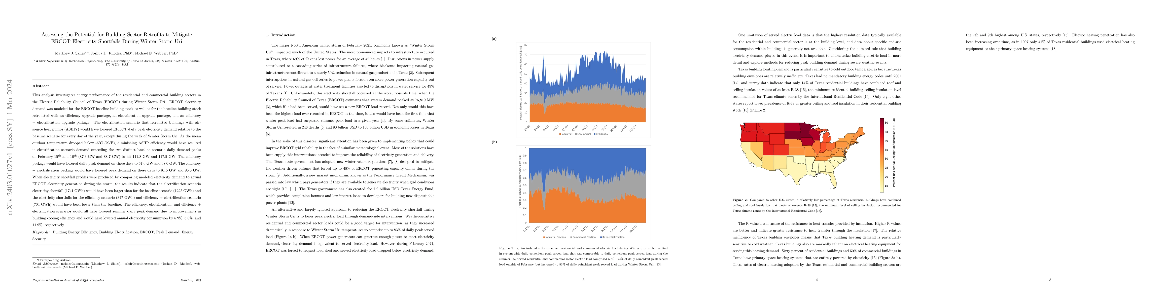 This study evaluates how building sector retrofits, including efficiency upgrades and electrification with air-source heat pumps, could mitigate ERCOT electricity shortfalls. During Winter Storm Uri, while electrification increased winter peak demand, retrofits notably reduced overall annual electricity consumption and peak demand in summer.
