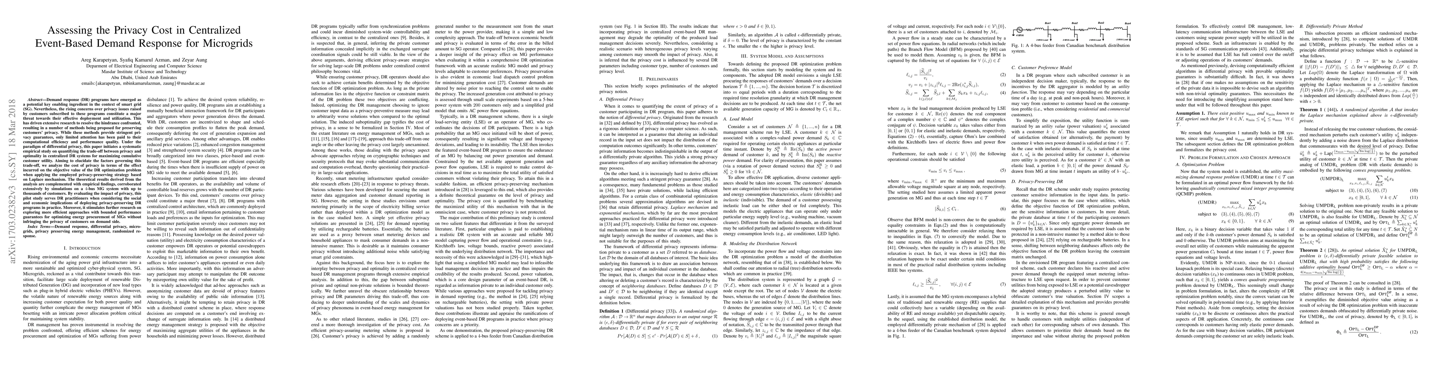 Demand response (DR) programs have emerged as a potential key enabling ingredient in the context of smart grid (SG). Nevertheless, the rising concerns over privacy issues raised by customers subscribed to these programs constitute a major threat towards their effective deployment and utilization. This has driven extensive research to resolve the hindrance confronted, resulting in a number of methods being proposed for preserving customers' privacy. While these methods provide stringent privacy guarantees, only limited attention has been paid to their computational efficiency and performance quality. Under the paradigm of differential privacy, this paper initiates a systematic empirical study on quantifying the trade-off between privacy and optimality in centralized DR systems for maximizing cumulative customer utility. Aiming to elucidate the factors governing this trade-off, we analyze the cost of privacy in terms of the effect incurred on the objective value of the DR optimization problem when applying the employed privacy-preserving strategy based on Laplace mechanism. The theoretical results derived from the analysis are complemented with empirical findings, corroborated extensively by simulations on a 4-bus MG system with up to thousands of customers. By evaluating the impact of privacy, this pilot study serves DR practitioners when considering the social and economic implications of deploying privacy-preserving DR programs in practice. Moreover, it stimulates further research on exploring more efficient approaches with bounded performance guarantees for optimizing energy procurement of MGs without infringing the privacy of customers on demand side.