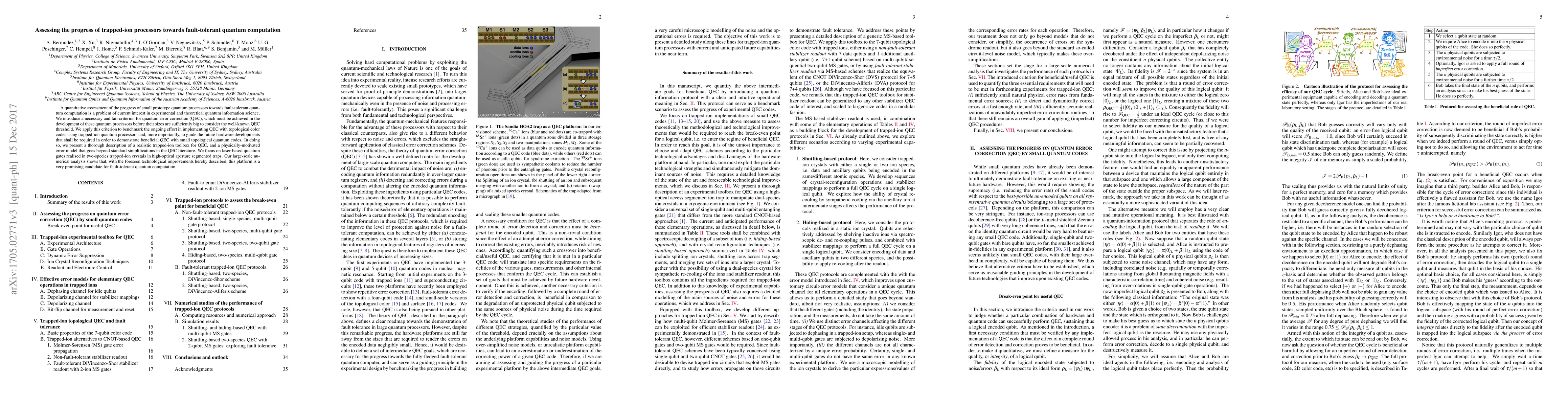 This paper assesses the progress of trapped-ion quantum processors towards fault-tolerant quantum computation, introducing a criterion for quantum error correction (QEC) and applying it to benchmark current efforts using topological color codes. The study concludes that improved two-species trapped-ion crystals in high-optical aperture segmented traps show promising potential for achieving fault-tolerant quantum computation.