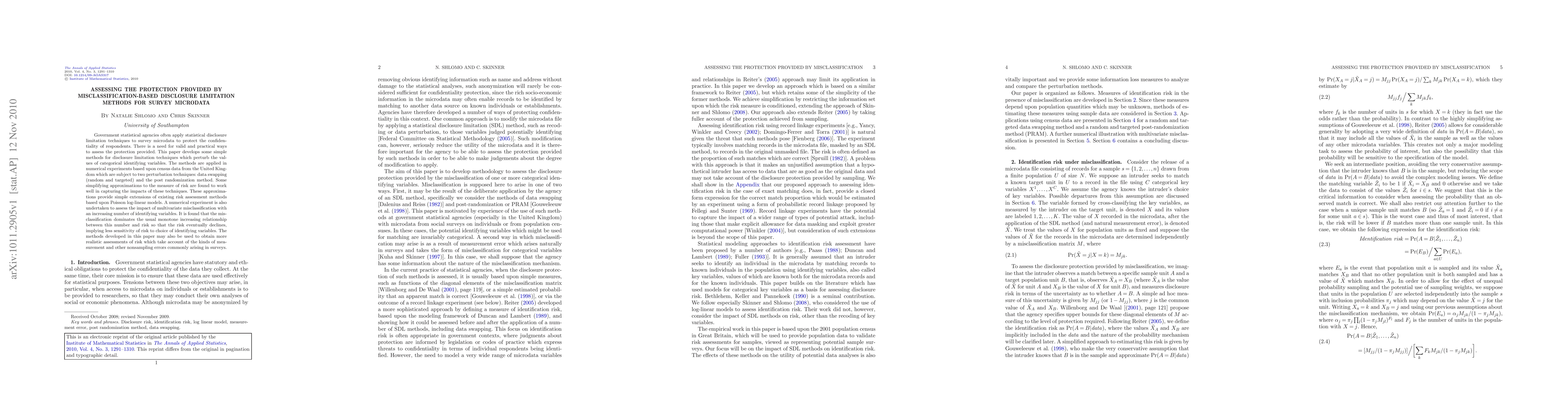 A new approach was developed to assess the protection of survey microdata confidentiality using misclassification-based disclosure limitation techniques. The study found that adding more identifying variables actually reduces the risk of disclosure.