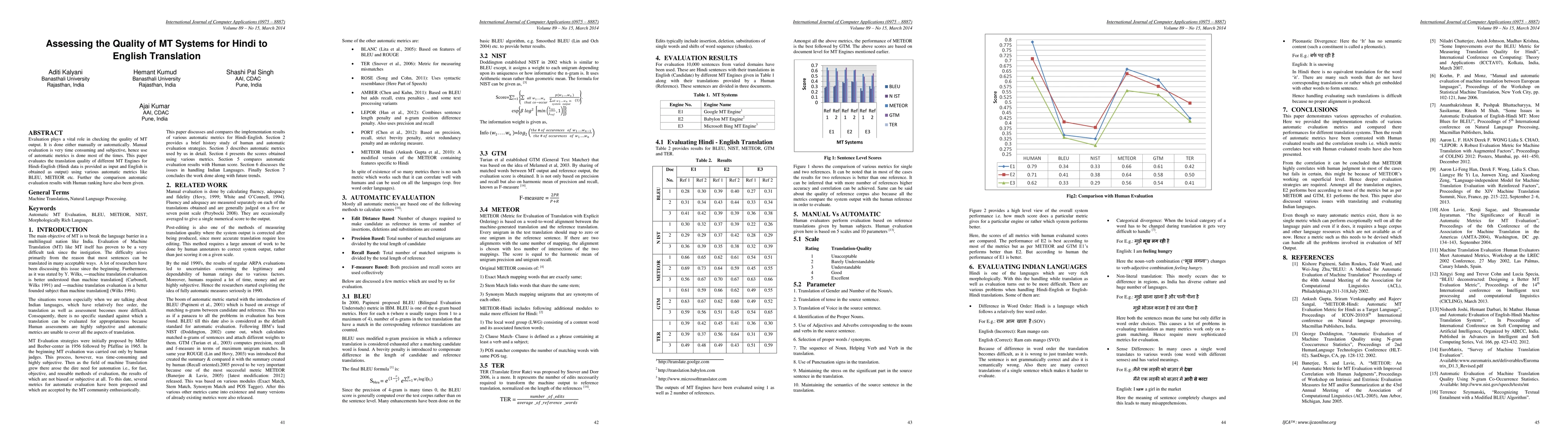 This paper evaluates the quality of Hindi to English machine translation systems using automatic metrics such as BLEU and METEOR, and compares these results with human rankings to assess overall translation quality.