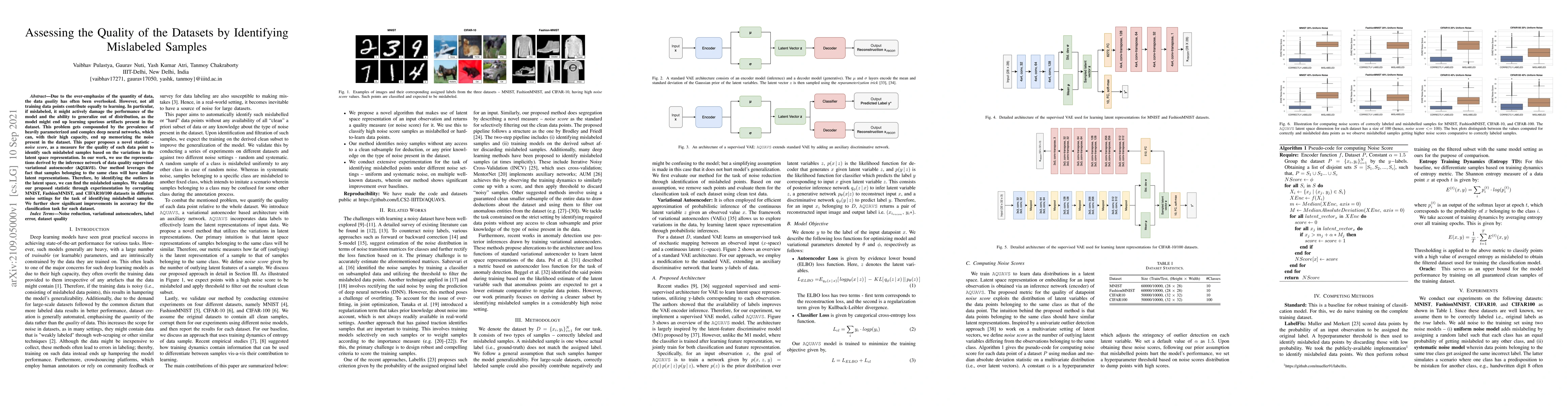 Due to the over-emphasize of the quantity of data, the data quality has often been overlooked. However, not all training data points contribute equally to learning. In particular, if mislabeled, it might actively damage the performance of the model and the ability to generalize out of distribution, as the model might end up learning spurious artifacts present in the dataset. This problem gets compounded by the prevalence of heavily parameterized and complex deep neural networks, which can, with their high capacity, end up memorizing the noise present in the dataset. This paper proposes a novel statistic -- noise score, as a measure for the quality of each data point to identify such mislabeled samples based on the variations in the latent space representation. In our work, we use the representations derived by the inference network of data quality supervised variational autoencoder (AQUAVS). Our method leverages the fact that samples belonging to the same class will have similar latent representations. Therefore, by identifying the outliers in the latent space, we can find the mislabeled samples. We validate our proposed statistic through experimentation by corrupting MNIST, FashionMNIST, and CIFAR10/100 datasets in different noise settings for the task of identifying mislabelled samples. We further show significant improvements in accuracy for the classification task for each dataset.