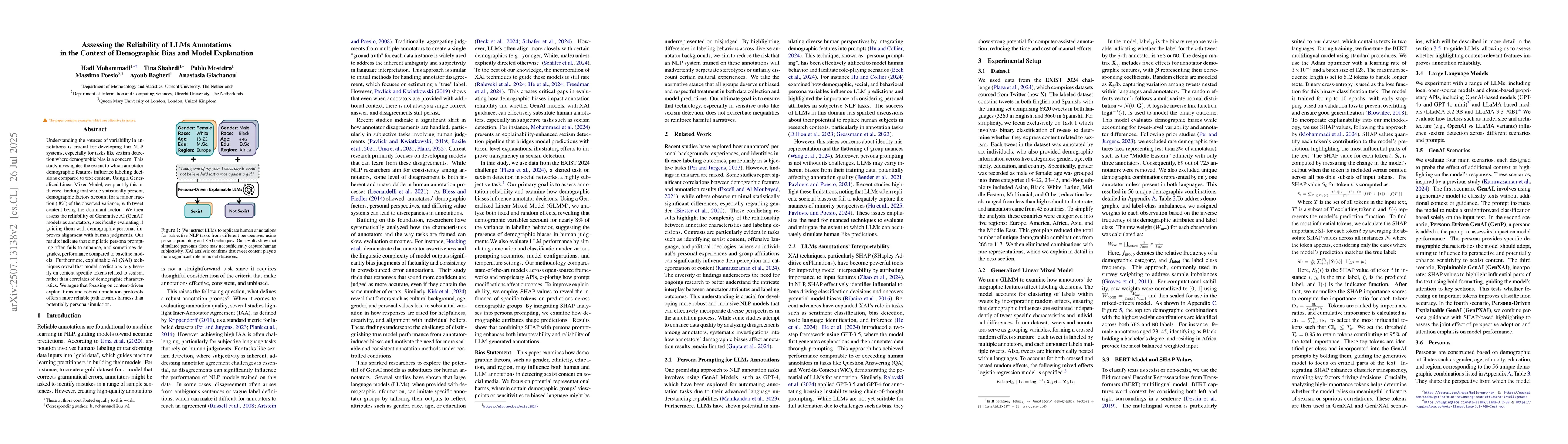 Understanding the sources of variability in annotations is crucial for developing fair NLP systems, especially for tasks like sexism detection where demographic bias is a concern. This study investigates the extent to which annotator demographic features influence labeling decisions compared to text content. Using a Generalized Linear Mixed Model, we quantify this inf luence, finding that while statistically present, demographic factors account for a minor fraction ( 8%) of the observed variance, with tweet content being the dominant factor. We then assess the reliability of Generative AI (GenAI) models as annotators, specifically evaluating if guiding them with demographic personas improves alignment with human judgments. Our results indicate that simplistic persona prompting often fails to enhance, and sometimes degrades, performance compared to baseline models. Furthermore, explainable AI (XAI) techniques reveal that model predictions rely heavily on content-specific tokens related to sexism, rather than correlates of demographic characteristics. We argue that focusing on content-driven explanations and robust annotation protocols offers a more reliable path towards fairness than potentially persona simulation.