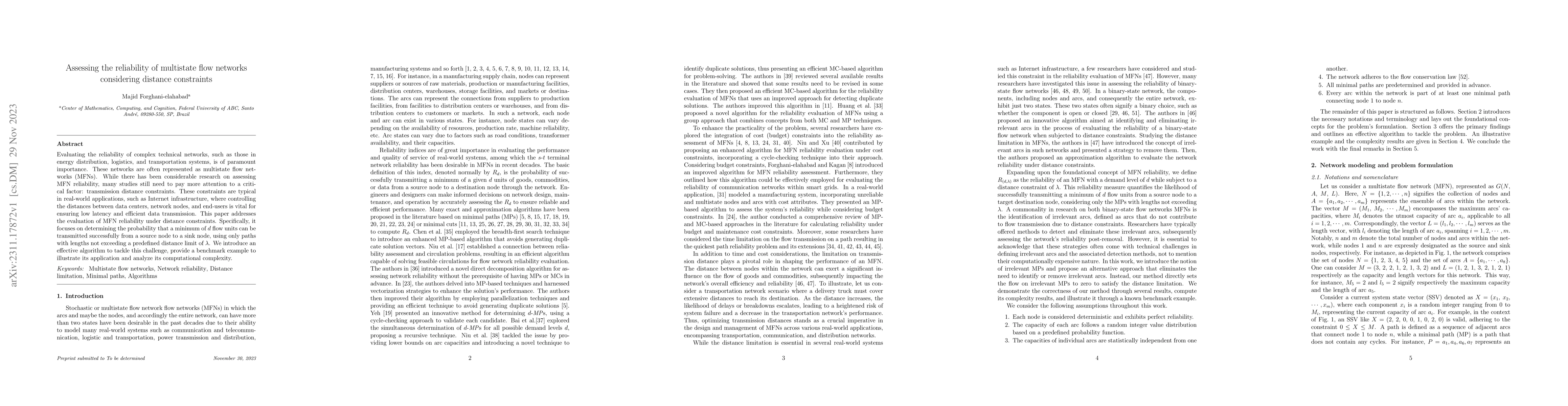 This paper evaluates the reliability of multistate flow networks under distance constraints, introducing an algorithm to determine the probability of transmitting at least $d$ flow units within a predefined distance limit $\lambda$. It provides a benchmark example and analyzes the computational complexity of the proposed method.