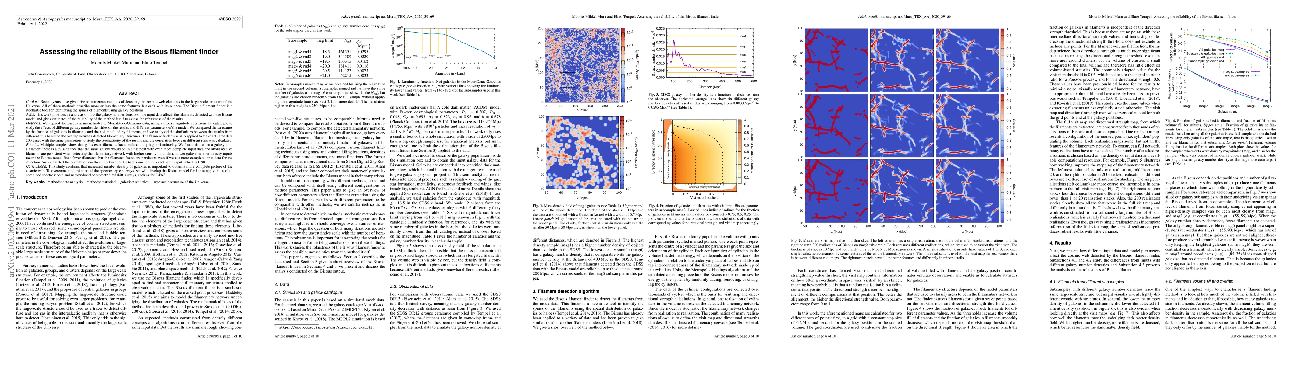 Aims. This work provides an analysis of how the galaxy number density of the input data affects the filaments detected with the Bisous filament finder and gives estimates of the reliability of the method itself to assess the robustness of the results. Methods. We applied the Bisous filament finder to MultiDark-Galaxies data, using various magnitude cuts from the catalogue to study the effects of different galaxy number densities on the results and different parameters of the model. We compared the structures by the fraction of galaxies in filaments and the volume filled by filaments, and we analysed the similarities between the results from different cuts based on the overlap between detected filamentary structures. The filament finder was also applied to the exact same data 200 times with the same parameters to study the stochasticity of the results and the correlation between different runs was calculated. Results. Multiple samples show that galaxies in filaments have preferentially higher luminosity. We found that when a galaxy is in a filament there is a 97% chance that the same galaxy would be in a filament with even more complete input data and about 85% of filaments are persistent when detecting the filamentary network with higher-density input data. Lower galaxy number density inputs mean the Bisous model finds fewer filaments, but the filaments found are persistent even if we use more complete input data for the detection. We calculated the correlation coefficient between 200 Bisous runs on the exact same input, which is 0.98. Conclusions. This study confirms that increased number density of galaxies is important to obtain a more complete picture of the cosmic web. To overcome the limitation of the spectroscopic surveys, we will develop the Bisous model further to apply this tool to combined spectroscopic and narrow-band photometric redshift surveys, such as the J-PAS.