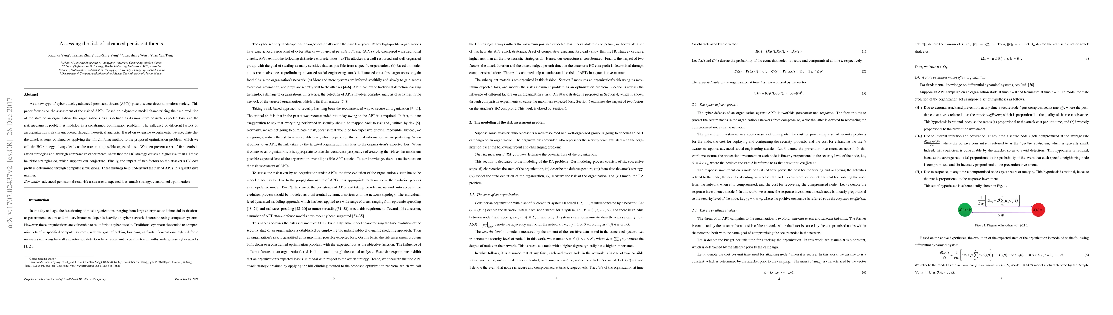 As a new type of cyber attacks, advanced persistent threats (APTs) pose a severe threat to modern society. This paper focuses on the assessment of the risk of APTs. Based on a dynamic model characterizing the time evolution of the state of an organization, the organization's risk is defined as its maximum possible expected loss, and the risk assessment problem is modeled as a constrained optimization problem. The influence of different factors on an organization's risk is uncovered through theoretical analysis. Based on extensive experiments, we speculate that the attack strategy obtained by applying the hill-climbing method to the proposed optimization problem, which we call the HC strategy, always leads to the maximum possible expected loss. We then present a set of five heuristic attack strategies and, through comparative experiments, show that the HC strategy causes a higher risk than all these heuristic strategies do, which supports our conjecture. Finally, the impact of two factors on the attacker's HC cost profit is determined through computer simulations. These findings help understand the risk of APTs in a quantitative manner.