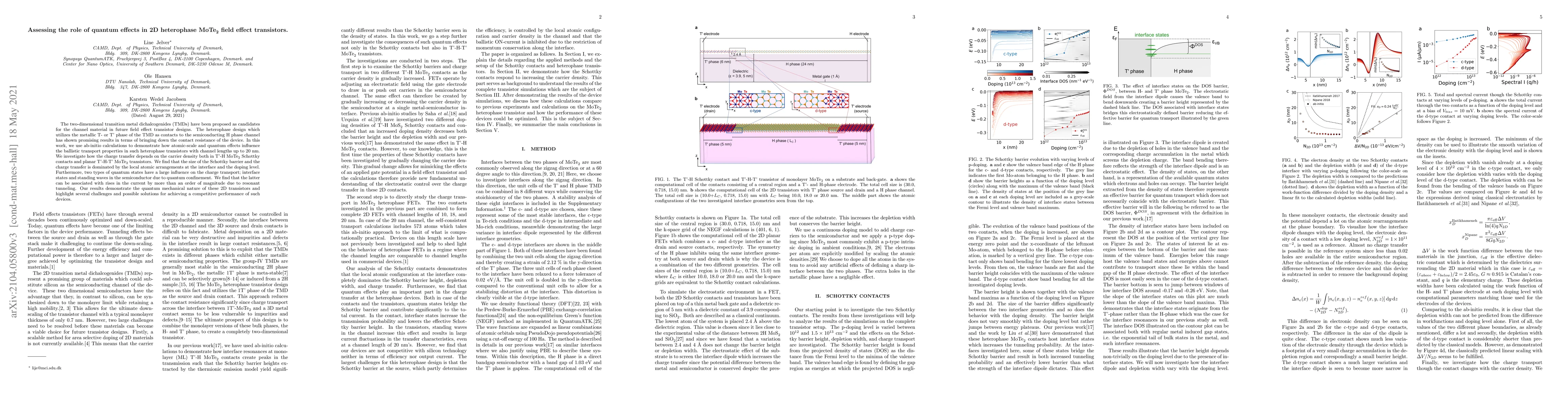 The two-dimensional transition metal dichalcogenides (TMDs) have been proposed as candidates for the channel material in future field effect transistor designs. The heterophase design which utilizes the metallic T- or T' phase of the TMD as contacts to the semiconducting H phase channel has shown promising results in terms of bringing down the contact resistance of the device. In this work, we use ab-initio calculations to demonstrate how atomic-scale and quantum effects influence the ballistic transport properties in such heterophase transistors with channel lengths up to 20 nm. We investigate how the charge transfer depends on the carrier density both in T'-H MoTe$_2$ Schottky contacts and planar T'-H-T' MoTe$_2$ transistors. We find that the size of the Schottky barrier and the charge transfer is dominated by the local atomic arrangements at the interface and the doping level. Furthermore, two types of quantum states have a large influence on the charge transport; interface states and standing waves in the semiconductor due to quantum confinement. We find that the latter can be associated with rises in the current by more than an order of magnitude due to resonant tunneling. Our results demonstrate the quantum mechanical nature of these 2D transistors and highlight several challenges and possible solutions for achieving a competitive performance of such devices.