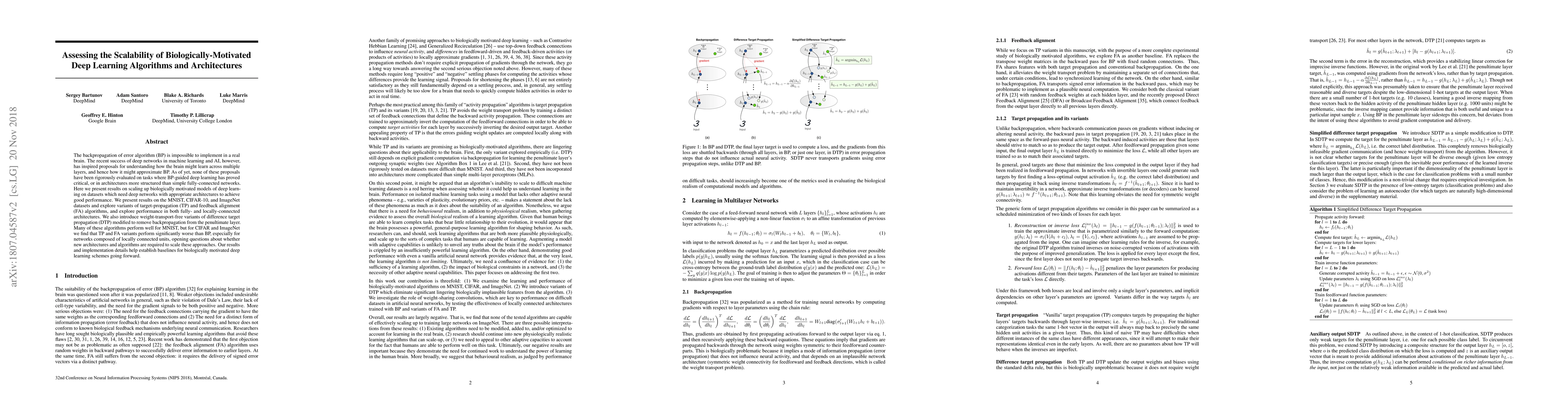 This paper evaluates the scalability of biologically-motivated deep learning algorithms like target-propagation and feedback alignment on standard datasets (MNIST, CIFAR-10, ImageNet). While these algorithms perform well on MNIST, they significantly underperform compared to backpropagation on more complex datasets, especially in locally-connected architectures, suggesting a need for new approaches to scale these biologically-inspired methods.