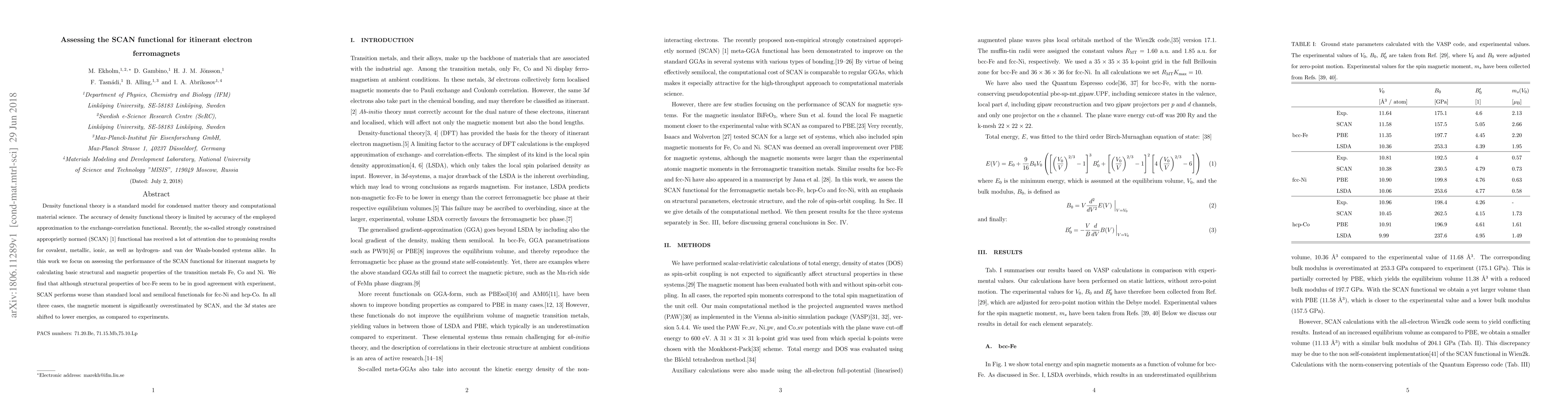 This paper evaluates the SCAN functional for density functional theory in itinerant electron ferromagnets, finding good agreement for bcc-Fe but poorer performance for fcc-Ni and hcp-Co, with significant overestimation of magnetic moments and incorrect $3d$ state energies.