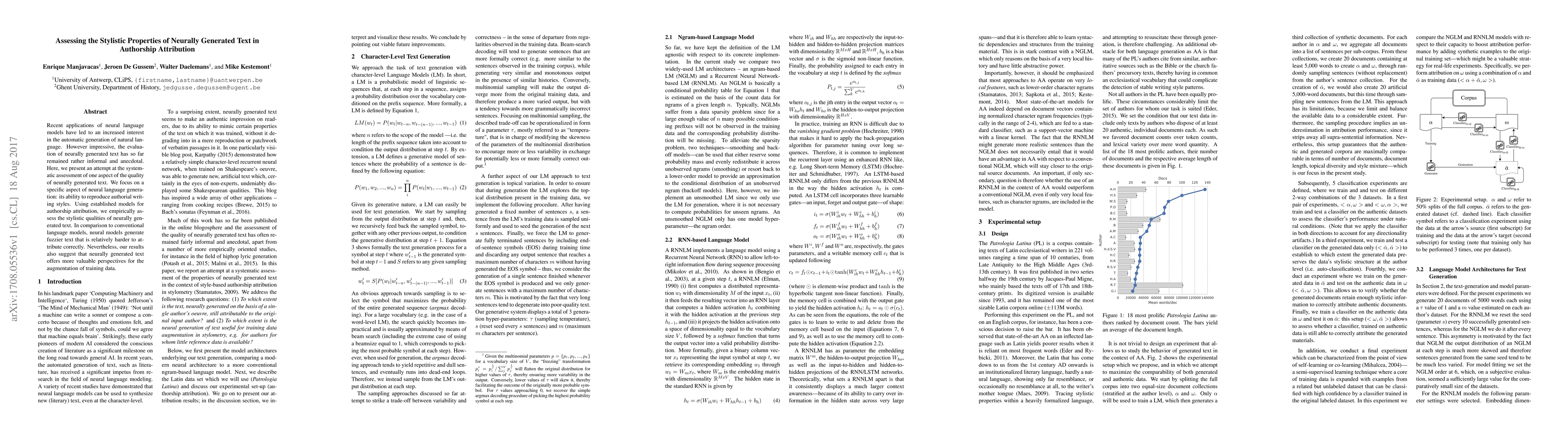 Recent applications of neural language models have led to an increased interest in the automatic generation of natural language. However impressive, the evaluation of neurally generated text has so far remained rather informal and anecdotal. Here, we present an attempt at the systematic assessment of one aspect of the quality of neurally generated text. We focus on a specific aspect of neural language generation: its ability to reproduce authorial writing styles. Using established models for authorship attribution, we empirically assess the stylistic qualities of neurally generated text. In comparison to conventional language models, neural models generate fuzzier text that is relatively harder to attribute correctly. Nevertheless, our results also suggest that neurally generated text offers more valuable perspectives for the augmentation of training data.