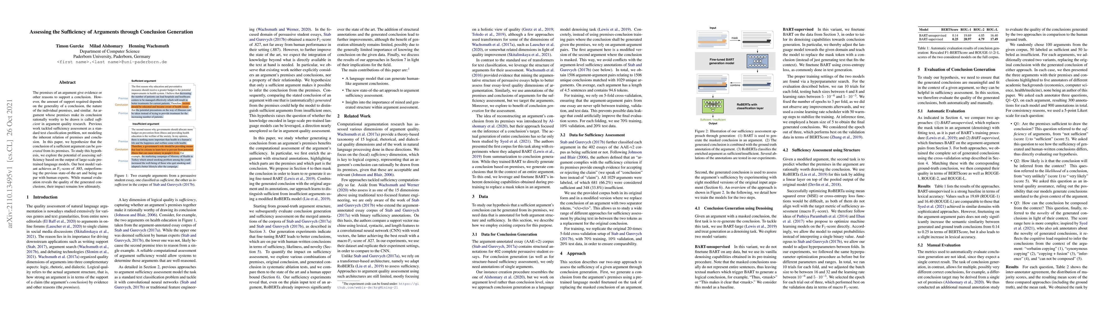 This paper explores assessing the sufficiency of arguments by generating conclusions from premises using large-scale pre-trained language models, achieving an F1-score of .885 and outperforming previous methods. The generated conclusions show promise but have limited practical impact.