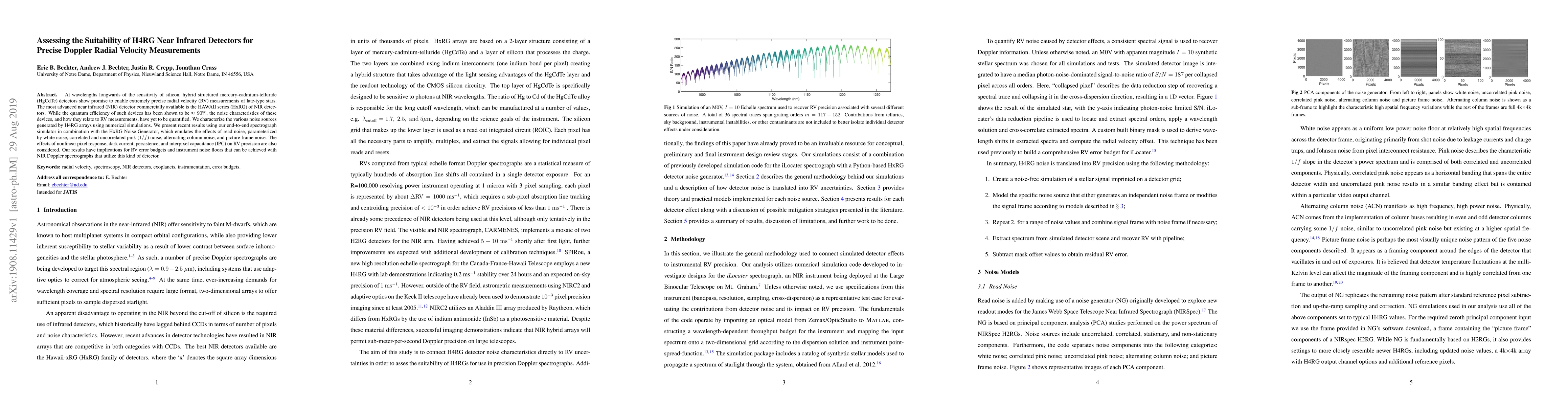 At wavelengths longwards of the sensitivity of silicon, hybrid structured mercury-cadmium-telluride (HgCdTe) detectors show promise to enable extremely precise radial velocity (RV) measurements of late-type stars. The most advanced near infrared (NIR) detector commercially available is the HAWAII series (HxRG) of NIR detectors. While the quantum efficiency of such devices has been shown to be approx ninety percent, the noise characteristics of these devices, and how they relate to RV measurements, have yet to be quantified. We characterize the various noise sources generated by H4RG arrays using numerical simulations. We present recent results using our end-to-end spectrograph simulator in combination with the HxRG Noise Generator, which emulates the effects of read noise, parameterized by white noise, correlated and uncorrelated pink noise, alternating column noise, and picture frame noise. The effects of nonlinear pixel response, dark current, persistence, and interpixel capacitance (IPC) on RV precision are also considered. Our results have implications for RV error budgets and instrument noise floors that can be achieved with NIR Doppler spectrographs that utilize this kind of detector.