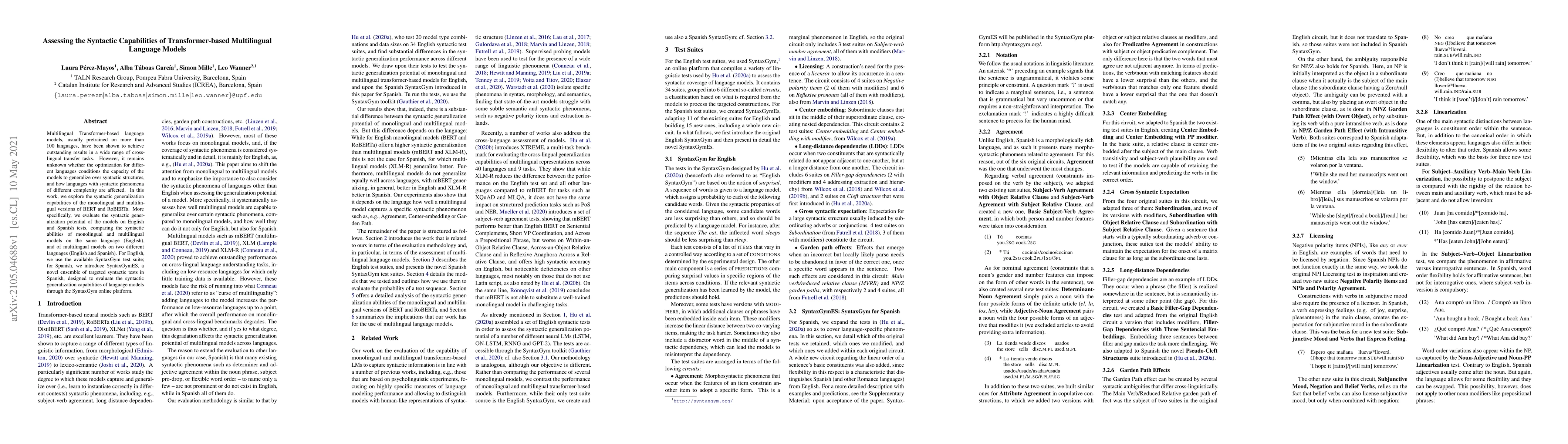 This paper investigates the syntactic generalization abilities of multilingual Transformer-based language models like BERT and RoBERTa, comparing monolingual and multilingual versions on English and Spanish syntactic tasks. It introduces SyntaxGymES for Spanish and evaluates the syntactic performance across languages.