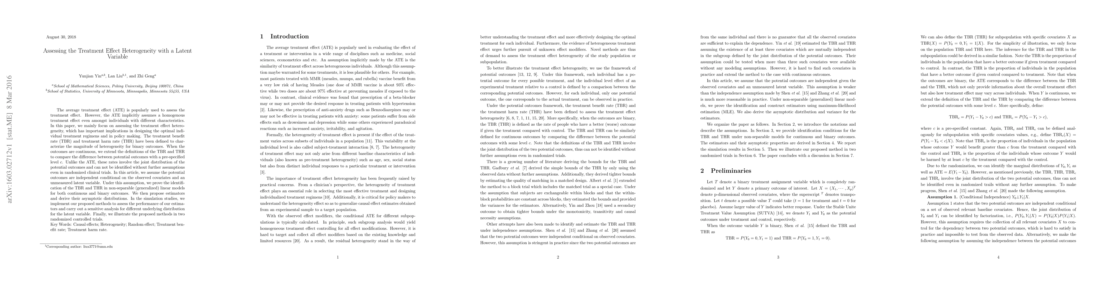 This paper assesses treatment effect heterogeneity using latent variables to define treatment benefit and harm rates for both binary and continuous outcomes. It proposes estimators for these rates under the assumption of conditional independence given observed covariates and an unmeasured latent variable, and evaluates their performance through simulations and real trial data.