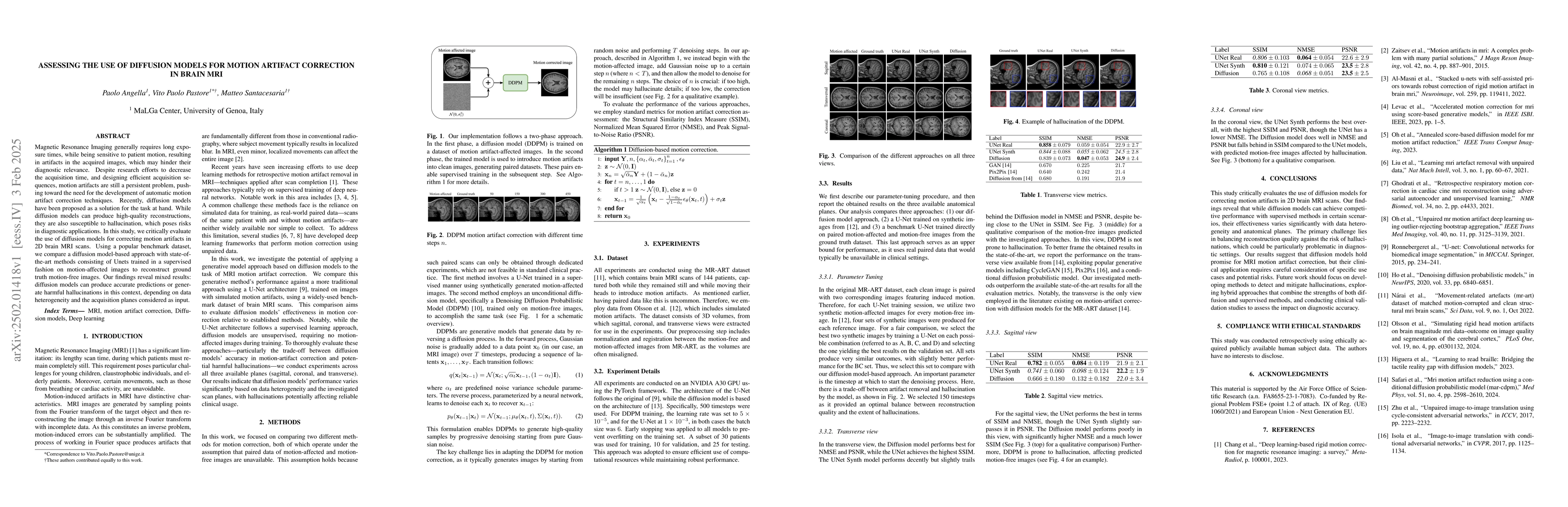The study presents a comprehensive evaluation of diffusion models for motion artifact correction in brain MRI, comparing them with supervised UNet methods.