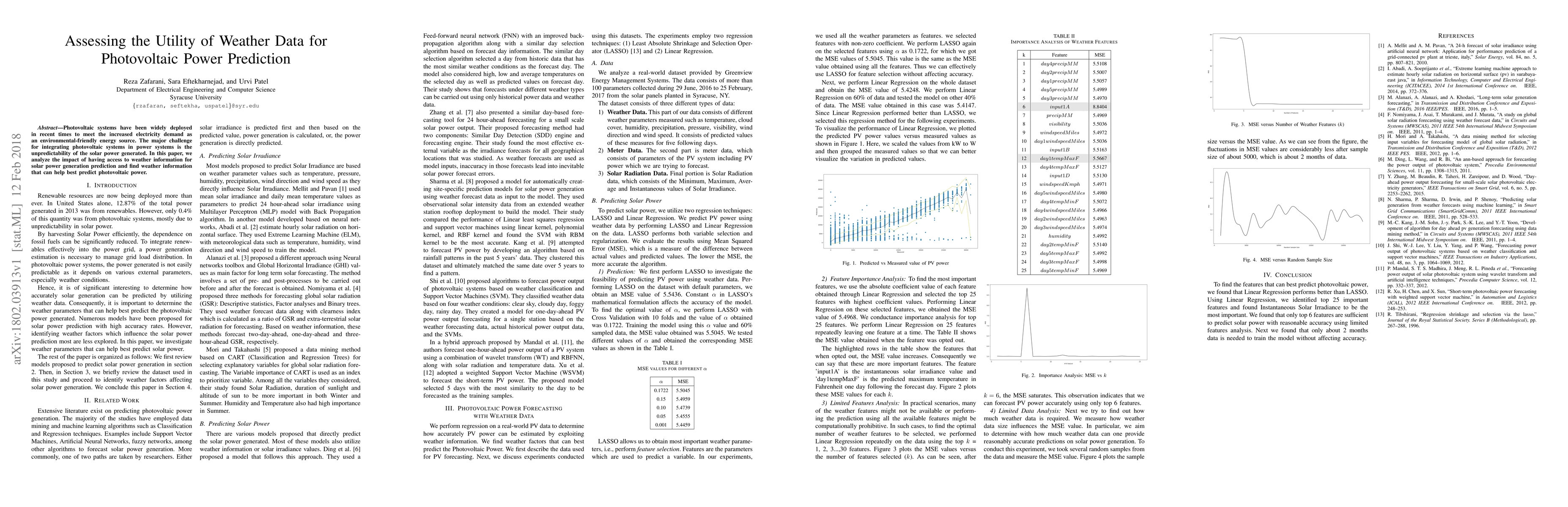 Photovoltaic systems have been widely deployed in recent times to meet the increased electricity demand as an environmental-friendly energy source. The major challenge for integrating photovoltaic systems in power systems is the unpredictability of the solar power generated. In this paper, we analyze the impact of having access to weather information for solar power generation prediction and find weather information that can help best predict photovoltaic power.