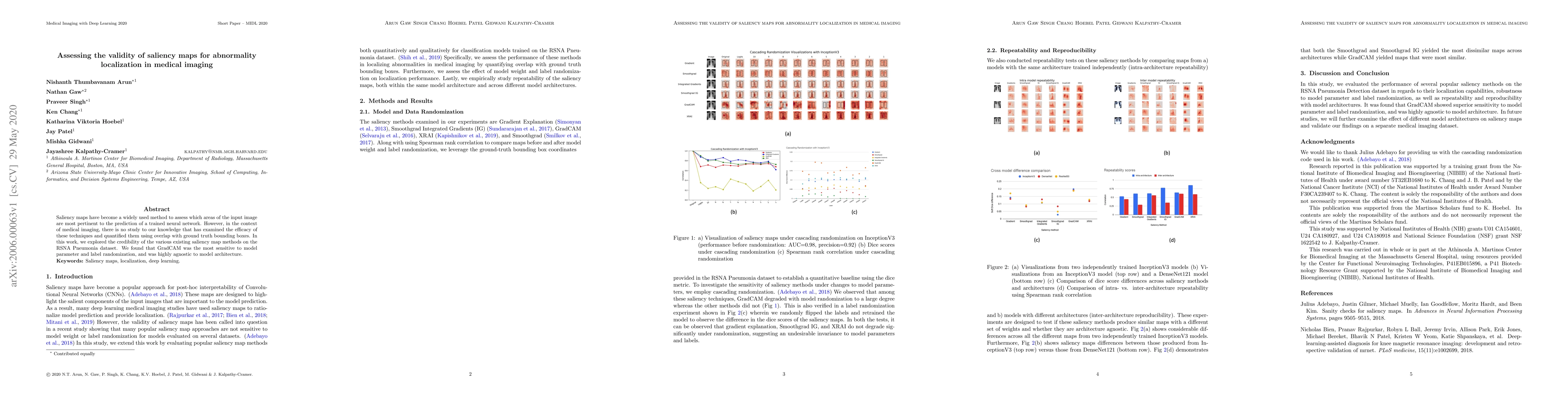 Saliency maps were evaluated on the RSNA Pneumonia dataset to assess their validity for abnormality localization in medical imaging. GradCAM was found to be highly sensitive to model parameters and architecture changes.