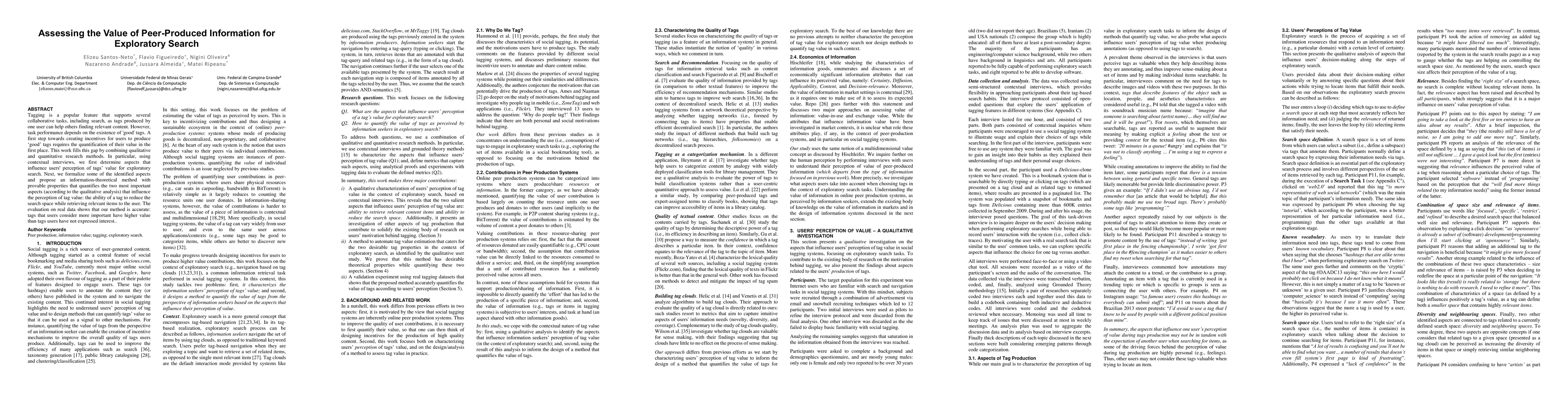 Tagging is a popular feature that supports several collaborative tasks, including search, as tags produced by one user can help others finding relevant content. However, task performance depends on the existence of 'good' tags. A first step towards creating incentives for users to produce 'good' tags is the quantification of their value in the first place. This work fills this gap by combining qualitative and quantitative research methods. In particular, using contextual interviews, we first determine aspects that influence users' perception of tags' value for exploratory search. Next, we formalize some of the identified aspects and propose an information-theoretical method with provable properties that quantifies the two most important aspects (according to the qualitative analysis) that influence the perception of tag value: the ability of a tag to reduce the search space while retrieving relevant items to the user. The evaluation on real data shows that our method is accurate: tags that users consider more important have higher value than tags users have not expressed interest.