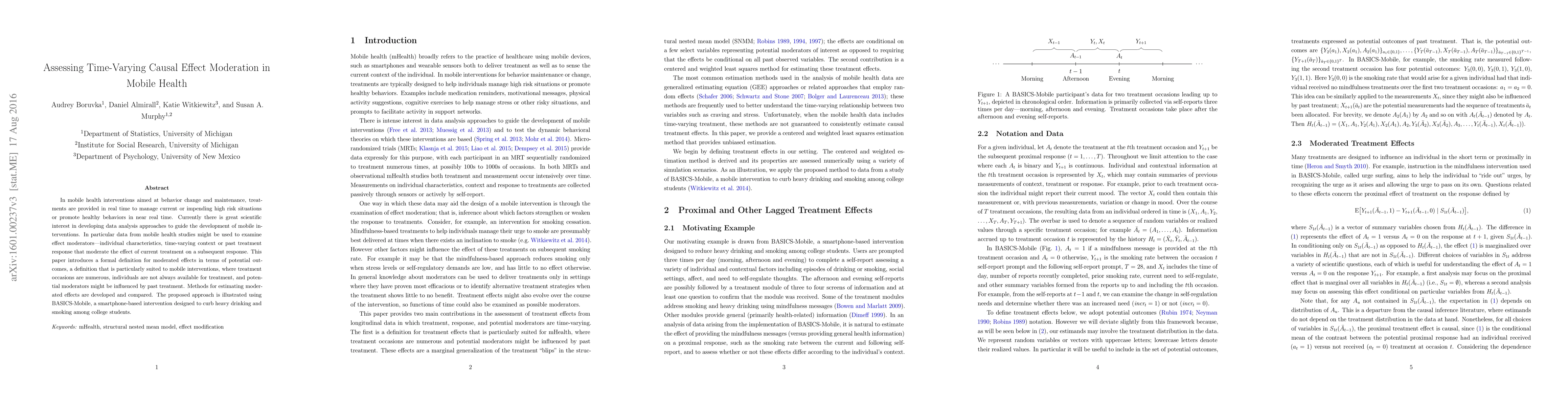 This paper develops methods to assess time-varying causal effect moderation in mobile health interventions, introducing a formal definition for moderated effects suited to frequent treatment occasions and mobile contexts. The proposed approach is demonstrated using BASICS-Mobile, an intervention targeting college students' heavy drinking and smoking.
