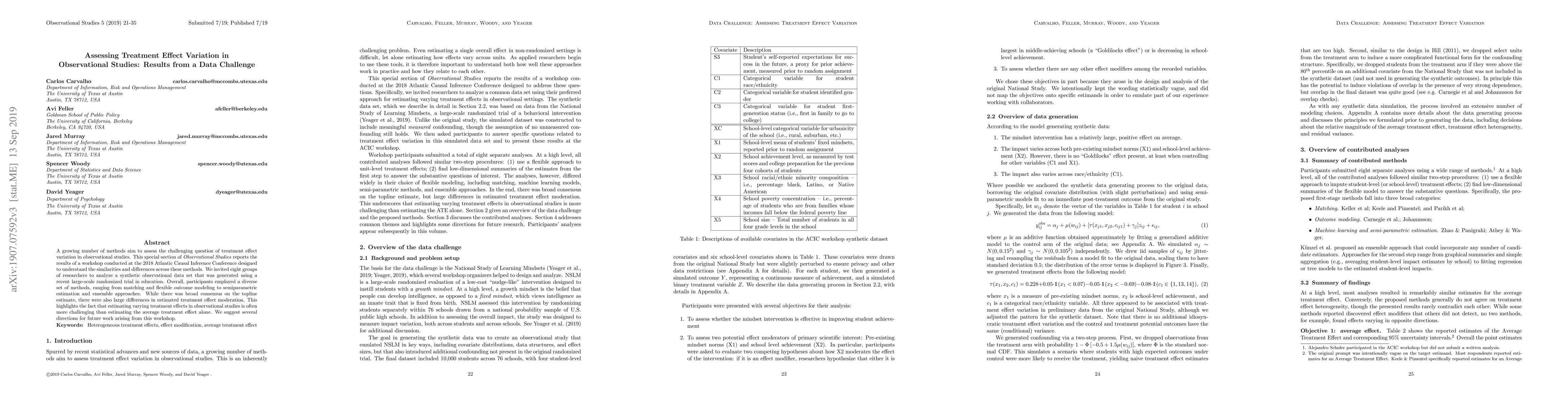 A growing number of methods aim to assess the challenging question of treatment effect variation in observational studies. This special section of "Observational Studies" reports the results of a workshop conducted at the 2018 Atlantic Causal Inference Conference designed to understand the similarities and differences across these methods. We invited eight groups of researchers to analyze a synthetic observational data set that was generated using a recent large-scale randomized trial in education. Overall, participants employed a diverse set of methods, ranging from matching and flexible outcome modeling to semiparametric estimation and ensemble approaches. While there was broad consensus on the topline estimate, there were also large differences in estimated treatment effect moderation. This highlights the fact that estimating varying treatment effects in observational studies is often more challenging than estimating the average treatment effect alone. We suggest several directions for future work arising from this workshop.