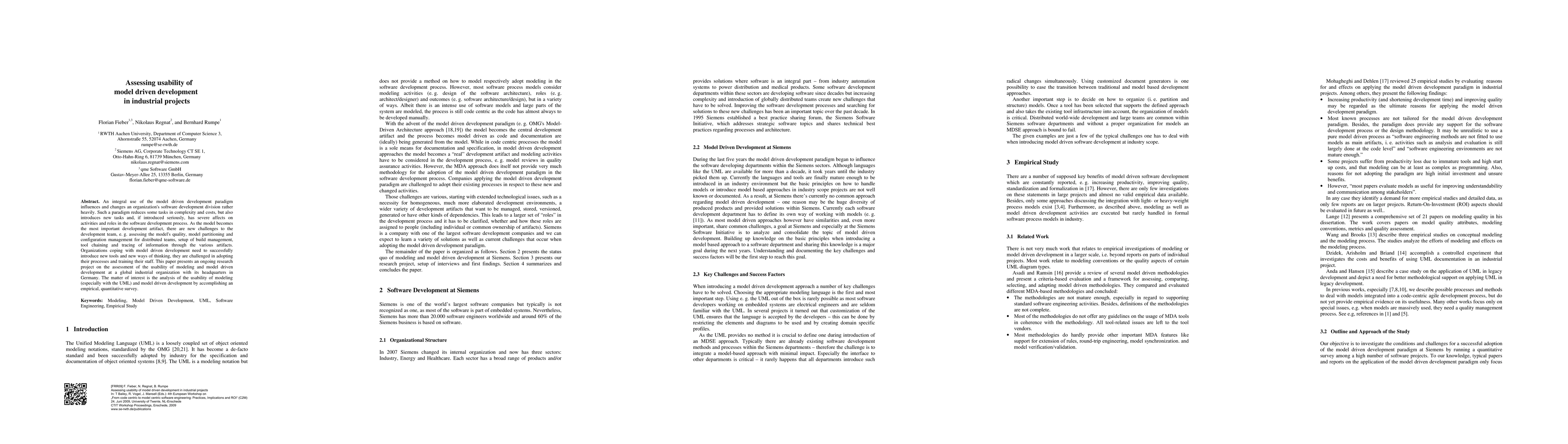 This paper investigates the usability of model driven development in industrial projects, focusing on the challenges and impacts on software development processes and teams. It conducts an empirical, quantitative survey within a global industrial organization to assess the usability of modeling, particularly using UML.