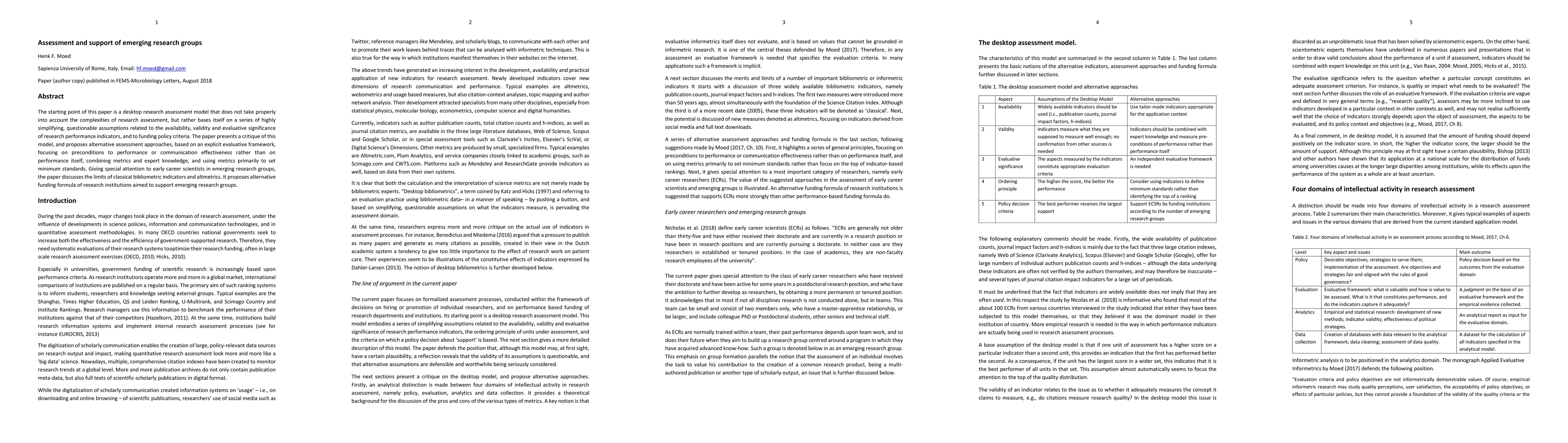 The starting point of this paper is a desktop research assessment model that does not take properly into account the complexities of research assessment, but rather bases itself on a series of highly simplifying, questionable assumptions related to the availability, validity and evaluative significance of research performance indicators, and to funding policy criteria. The paper presents a critique of this model, and proposes alternative assessment approaches, based on an explicit evaluative framework, focusing on preconditions to performance or communication effectiveness rather than on performance itself, combining metrics and expert knowledge, and using metrics primarily to set minimum standards. Giving special attention to early career scientists in emerging research groups, the paper discusses the limits of classical bibliometric indicators and altmetrics. It proposes alternative funding formula of research institutions aimed to support emerging research groups.