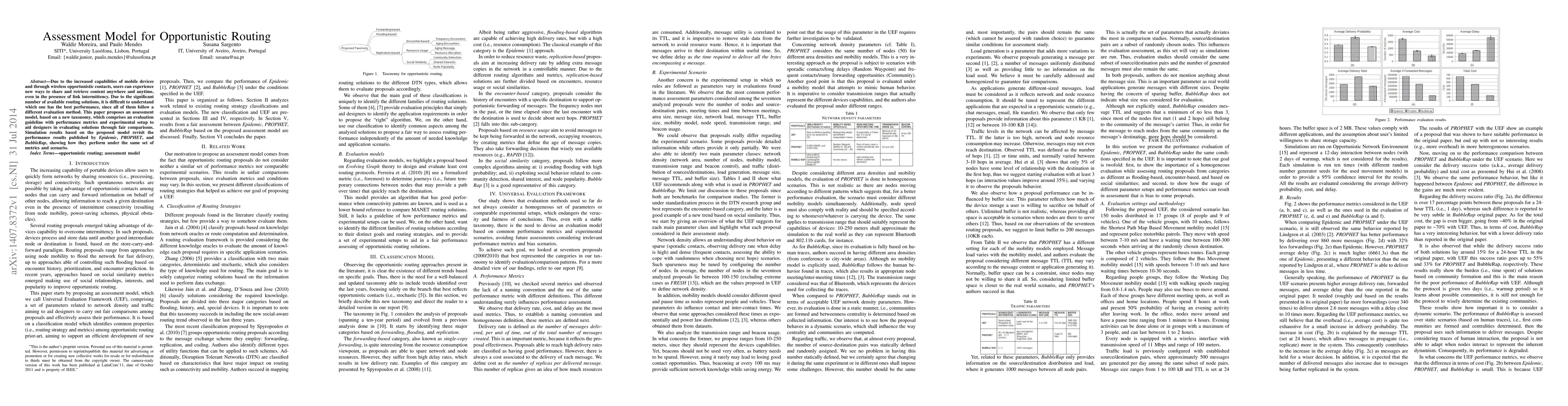 Due to the increased capabilities of mobile devices and through wireless opportunistic contacts, users can experience new ways to share and retrieve content anywhere and anytime, even in the presence of link intermittency. Due to the significant number of available routing solutions, it is difficult to understand which one has the best performance, since all of them follow a different evaluation method. This paper proposes an assessment model, based on a new taxonomy, which comprises an evaluation guideline with performance metrics and experimental setup to aid designers in evaluating solutions through fair comparisons. Simulation results based on the proposed model revisit the performance results published by Epidemic, PROPHET, and Bubble Rap, showing how they perform under the same set of metrics and scenario.