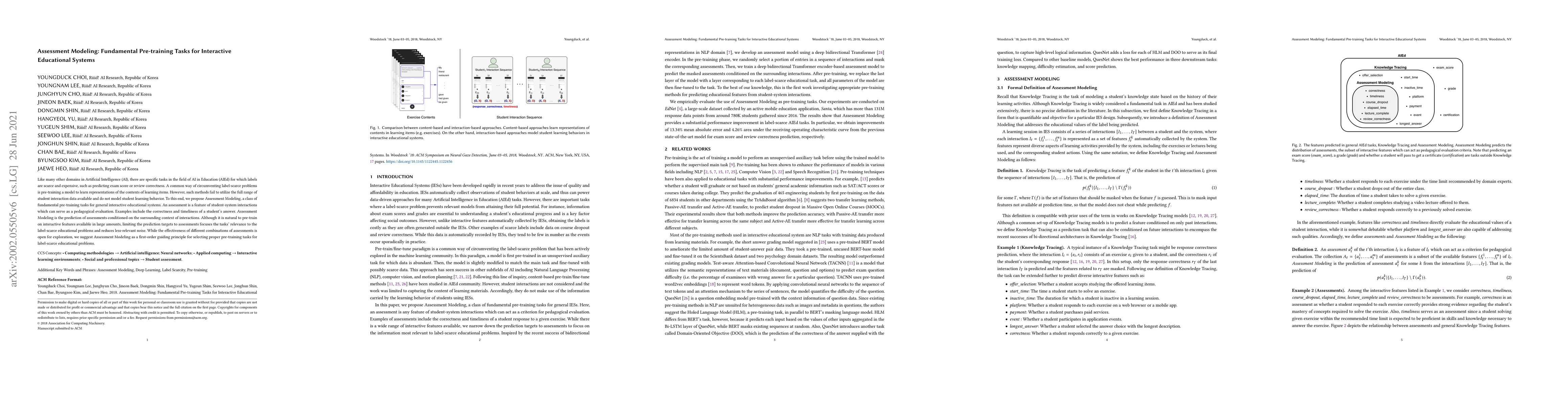 The paper proposes Assessment Modeling as a pre-training approach for interactive educational systems to tackle label-scarce problems in AI Education by predicting student assessments like correctness and timeliness of answers, thus focusing on relevant student interaction data and minimizing noise. The suggested method aims to guide the selection of effective pre-training tasks.