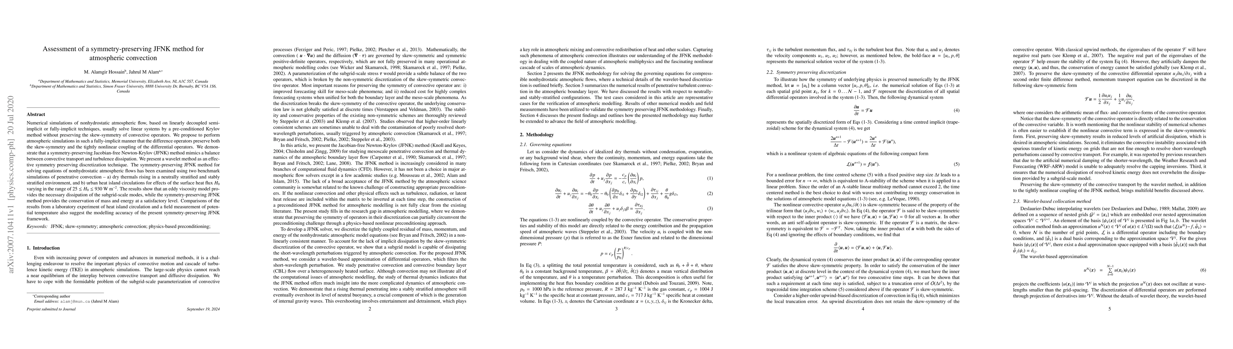 Numerical simulations of nonhydrostatic atmospheric flow, based on linearly decoupled semi-implicit or fully-implicit techniques, usually solve linear systems by a pre-conditioned Krylov method without preserving the skew-symmetry of convective operators. We propose to perform atmospheric simulations in such a fully-implicit manner that the difference operators preserve both the skew-symmetry and the tightly nonlinear coupling of the differential operators. We demonstrate that a symmetry-preserving Jacobian-free Newton-Krylov~(JFNK) method mimics a balance between convective transport and turbulence dissipation. We present a wavelet method as an effective symmetry preserving discretization technique. The symmetry-preserving JFNK method for solving equations of nonhydrostatic atmospheric flows has been examined using two benchmark simulations of penetrative convection -- a) dry thermals rising in a neutrally stratified and stably stratified environment, and b) urban heat island circulations for effects of the surface heat flux $H_0$ varying in the range of $25 \le H_0 \le 930$Wm$^{-2}$.The results show that an eddy viscosity model provides the necessary dissipation of the subgrid-scale modes, while the symmetry-preserving JFNK method provides the conservation of mass and energy at a satisfactory level. Comparisons of the results from a laboratory experiment of heat island circulation and a field measurement of potential temperature also suggest the modelling accuracy of the present symmetry-preserving JFNK framework.