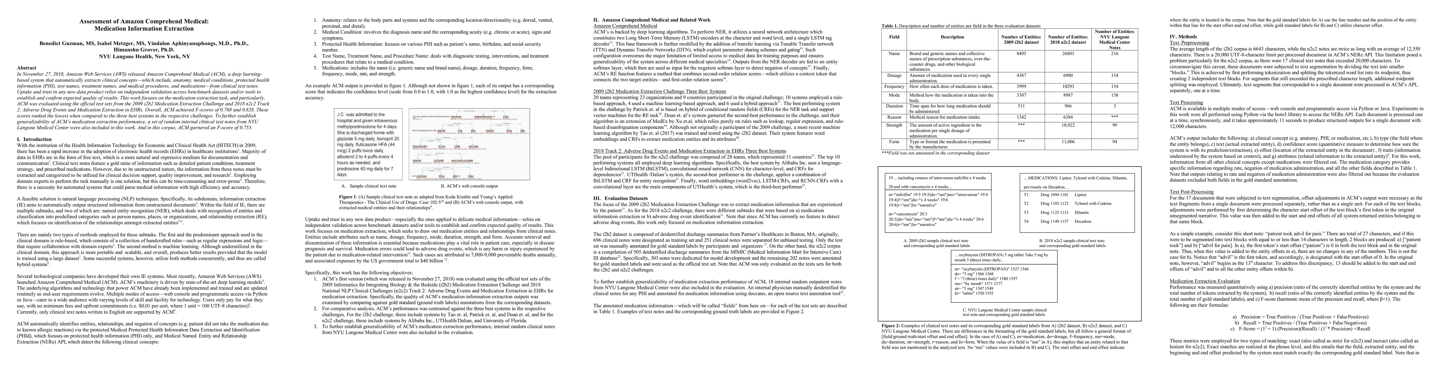 Amazon Comprehend Medical was evaluated for medication extraction using benchmark datasets from the 2009 i2b2 and 2018 n2c2 challenges, achieving F-scores of 0.768 and 0.828 respectively, ranking lower than the top systems. Further evaluation on internal NYU Langone clinical notes yielded an F-score of 0.753.