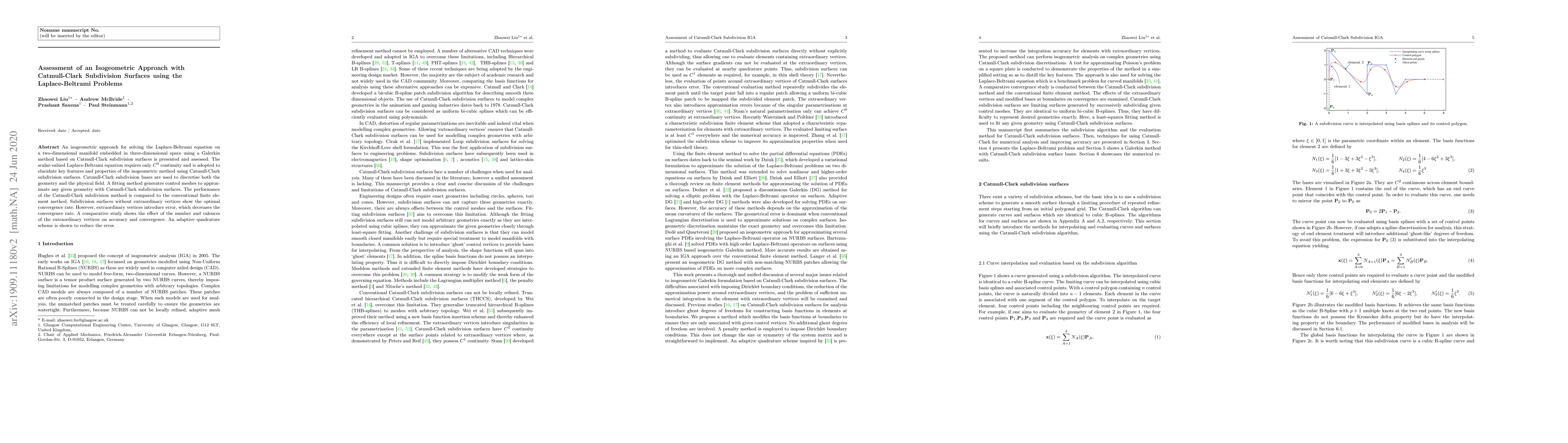 This paper assesses an isogeometric approach using Catmull-Clark subdivision surfaces for solving the Laplace-Beltrami equation, comparing it to the finite element method. The method shows optimal convergence without extraordinary vertices, but their presence reduces accuracy and convergence rate, which can be mitigated with adaptive quadrature.