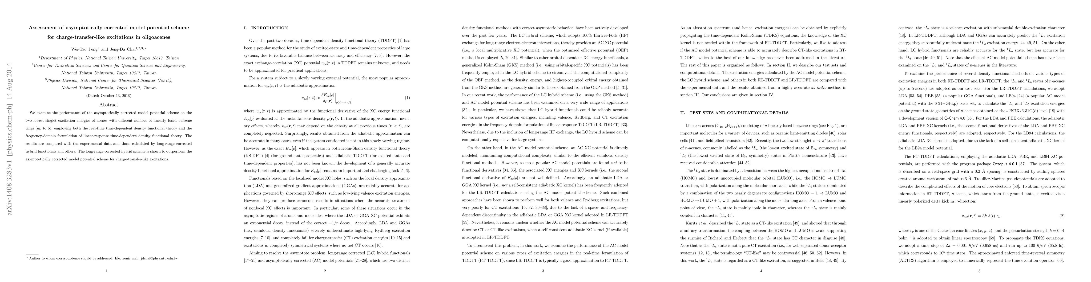 We examine the performance of the asymptotically corrected model potential scheme on the two lowest singlet excitation energies of acenes with different number of linearly fused benzene rings (up to 5), employing both the real-time time-dependent density functional theory and the frequency-domain formulation of linear-response time-dependent density functional theory. The results are compared with the experimental data and those calculated by long-range corrected hybrid functionals and others. The long-range corrected hybrid scheme is shown to outperform the asymptotically corrected model potential scheme for charge-transfer-like excitations.