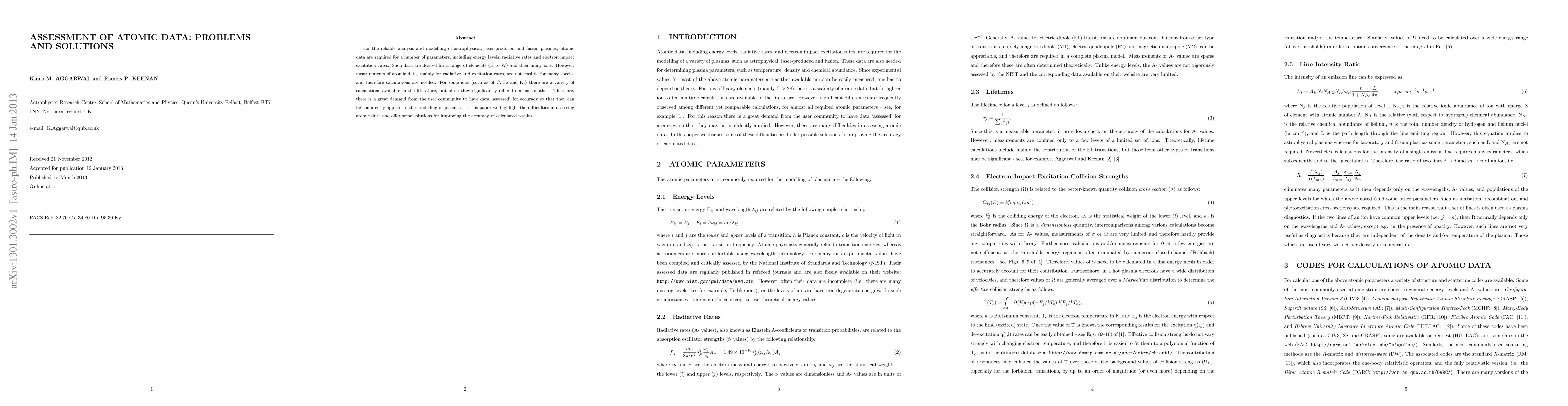 This paper addresses the challenge of assessing atomic data for accurate plasma modeling, highlighting difficulties in measuring data and offering solutions to improve calculation accuracy.