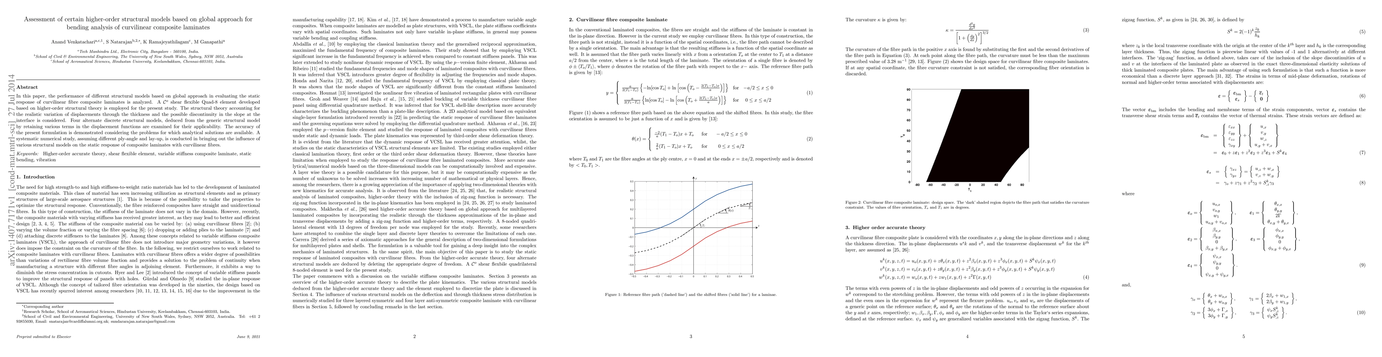 In this paper, the performance of different structural models based on global approach in evaluating the static response of curvilinear fibre composite laminates is analyzed. A Co shear flexible Quad-8 element developed based on higher-order structural theory is employed for the present study. The structural theory accounting for the realistic variation of displacements through the thickness and the possible discontinuity in the slope at the interface is considered. Four alternate discrete structural models, deduced from the generic structural model by retaining various terms in the displacement functions are examined for their applicability. The accuracy of the present formulation is demonstrated considering the problems for which analytical solutions are available. A systematic numerical study, assuming different ply-angle and lay-up, is conducted in bringing out the influence of various structural models on the static response of composite laminates with curvilinear fibres.