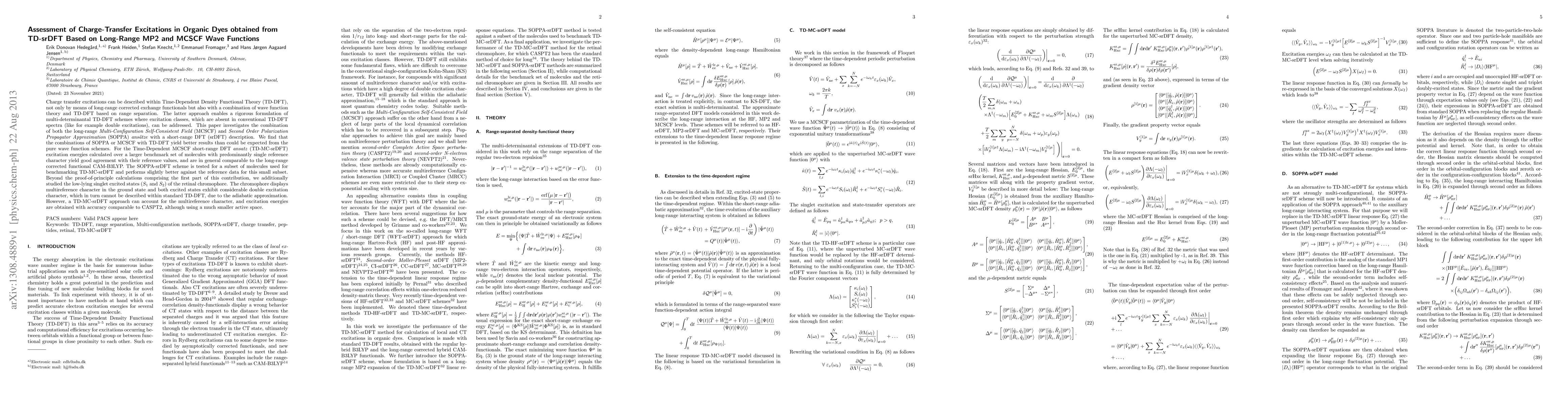 This paper evaluates charge-transfer excitations in organic dyes using a combination of long-range MCSCF and SOPPA wave functions with short-range DFT (TD-MC-srDFT and SOPPA-srDFT). The results show that these hybrid methods yield better accuracy than pure wave function approaches, especially for molecules with multireference character.