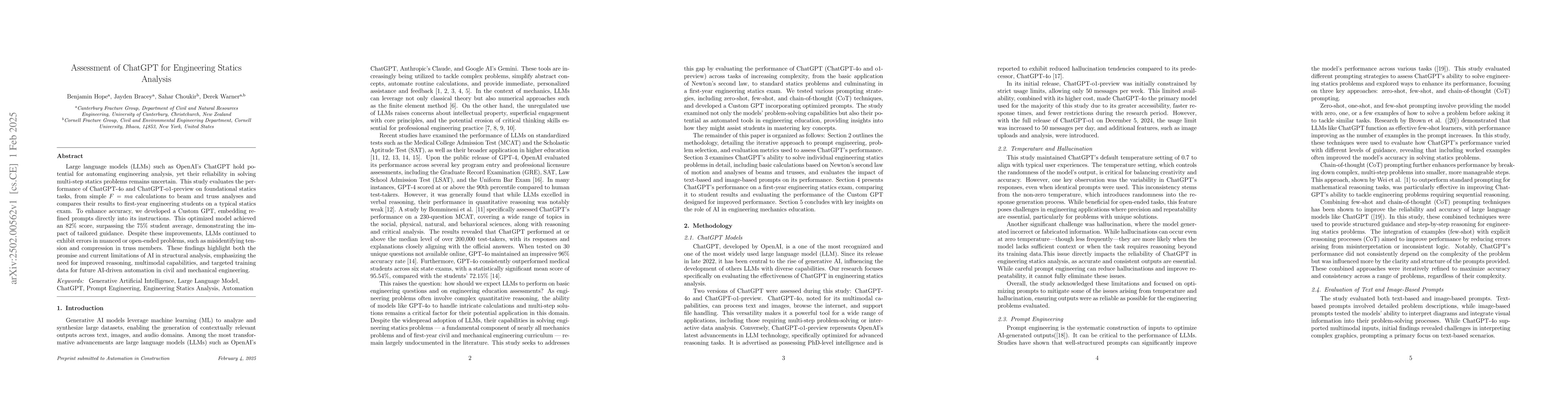 Large language models (LLMs) such as OpenAI's ChatGPT hold potential for automating engineering analysis, yet their reliability in solving multi-step statics problems remains uncertain. This study evaluates the performance of ChatGPT-4o and ChatGPT-o1-preview on foundational statics tasks, from simple calculations of Newton's second law of motion to beam and truss analyses and compares their results to first-year engineering students on a typical statics exam. To enhance accuracy, we developed a Custom GPT, embedding refined prompts directly into its instructions. This optimized model achieved an 82% score, surpassing the 75% student average, demonstrating the impact of tailored guidance. Despite these improvements, LLMs continued to exhibit errors in nuanced or open-ended problems, such as misidentifying tension and compression in truss members. These findings highlight both the promise and current limitations of AI in structural analysis, emphasizing the need for improved reasoning, multimodal capabilities, and targeted training data for future AI-driven automation in civil and mechanical engineering.