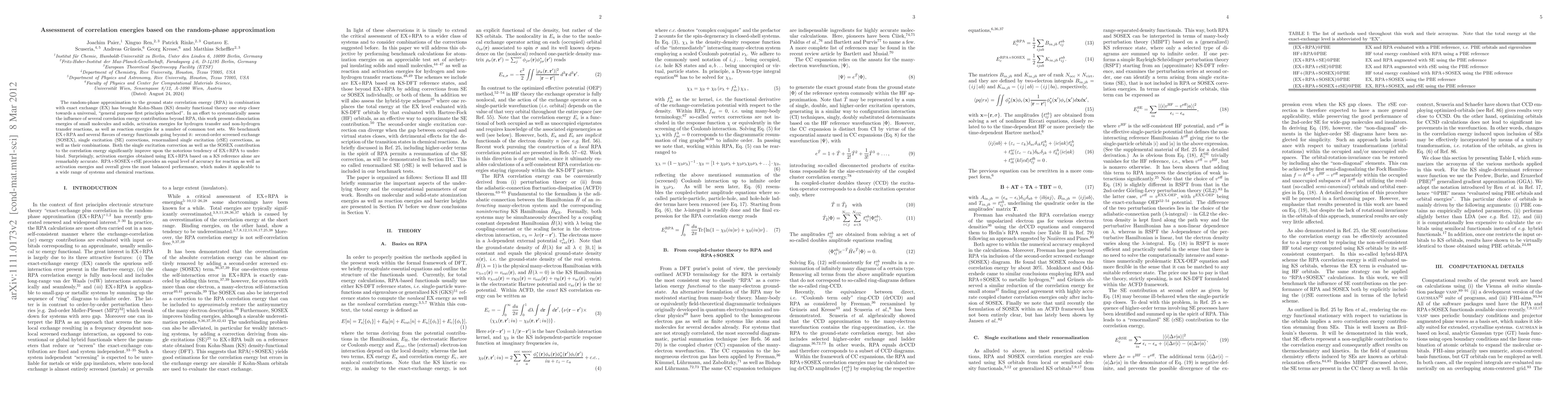 This paper benchmarks the random-phase approximation (RPA) combined with exact exchange (EX) against various advanced functionals for assessing correlation energies in density functional theory. The results show that while EX+RPA underbinds, incorporating single excitation and second-order screened exchange corrections significantly improves accuracy, with RPA+SOSEX+rSE providing the most balanced performance for a wide range of chemical reactions and activation energies.