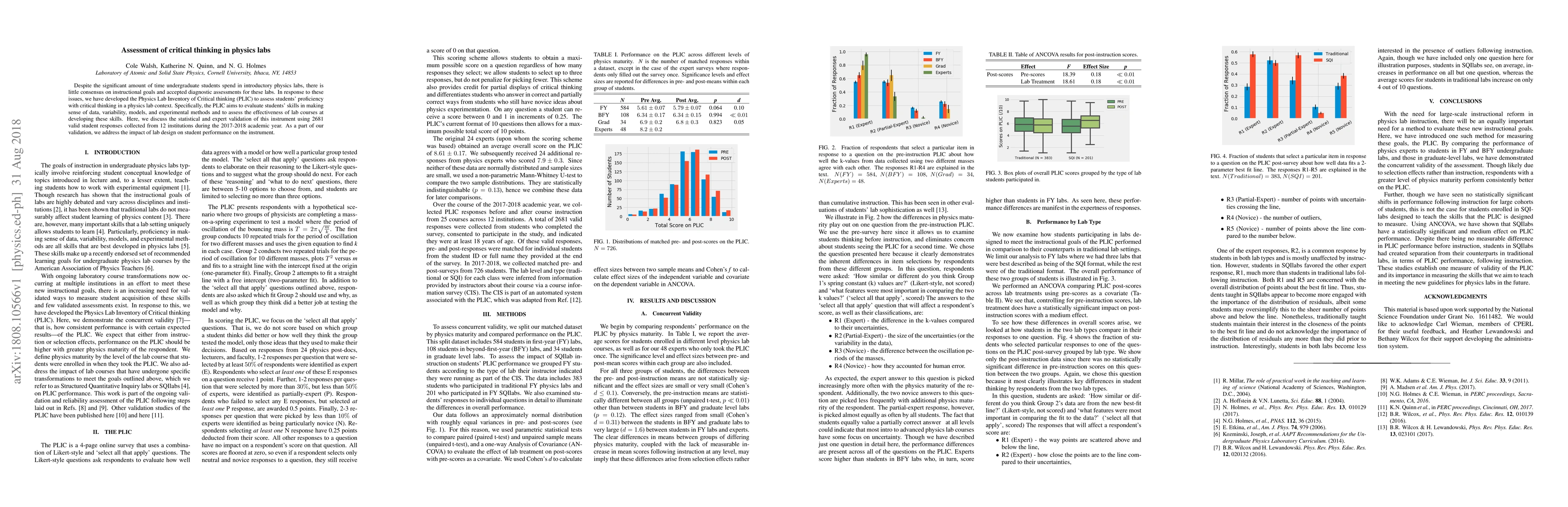 The study developed the Physics Lab Inventory of Critical thinking (PLIC) to assess students' critical thinking skills in physics labs, focusing on data interpretation, variability, models, and experimental methods. The PLIC was statistically validated using responses from 2681 students across 12 institutions, and its effectiveness was evaluated in relation to lab design.