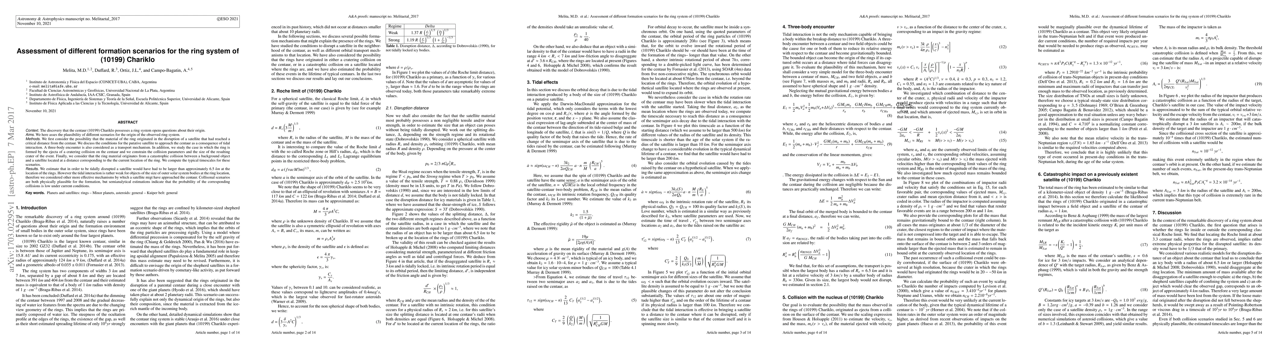 A detailed assessment of different formation scenarios for the rings system of (10199) Chariklo was conducted using a combination of numerical simulations and analytical models.