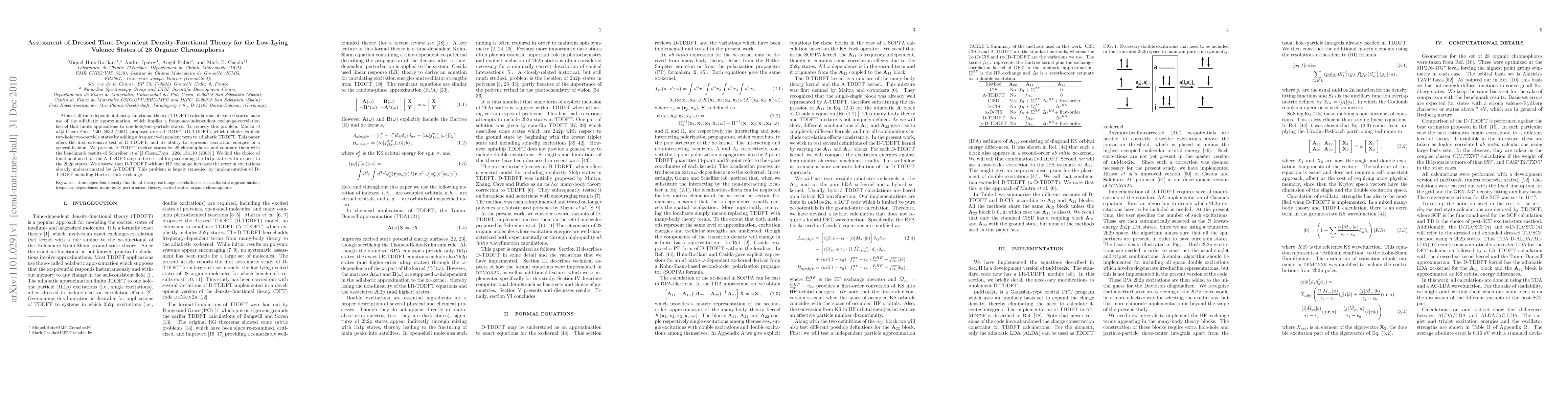 Almost all time-dependent density-functional theory (TDDFT) calculations of excited states make use of the adiabatic approximation, which implies a frequency-independent exchange-correlation kernel that limits applications to one-hole/one-particle states. To remedy this problem, Maitra et al.[J.Chem.Phys. 120, 5932 (2004)] proposed dressed TDDFT (D-TDDFT), which includes explicit two-hole/two-particle states by adding a frequency-dependent term to adiabatic TDDFT. This paper offers the first extensive test of D-TDDFT, and its ability to represent excitation energies in a general fashion. We present D-TDDFT excited states for 28 chromophores and compare them with the benchmark results of Schreiber et al.[J.Chem.Phys. 128, 134110 (2008).] We find the choice of functional used for the A-TDDFT step to be critical for positioning the 1h1p states with respect to the 2h2p states. We observe that D-TDDFT without HF exchange increases the error in excitations already underestimated by A-TDDFT. This problem is largely remedied by implementation of D- TDDFT including Hartree-Fock exchange.