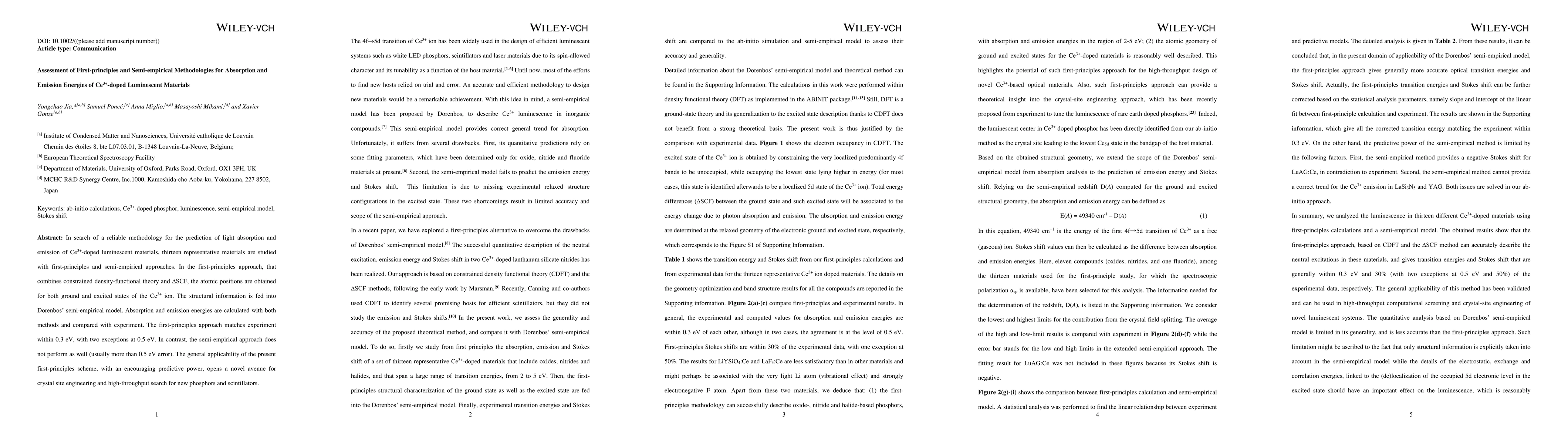 In search of a reliable methodology for the prediction of light absorption and emission of Ce$^{3+}$-doped luminescent materials, 13 representative materials are studied with first-principles and semiempirical approaches. In the first-principles approach, that combines constrained density-functional theory and $\Delta$SCF, the atomic positions are obtained for both ground and excited states of the Ce$^{3+}$ ion. The structural information is fed into Dorenbos' semiempirical model. Absorption and emission energies are calculated with both methods and compared with experiment. The first-principles approach matches experiment within 0.3 eV, with two exceptions at 0.5 eV. In contrast, the semiempirical approach does not perform as well (usually more than 0.5 eV error). The general applicability of the present first-principles scheme, with an encouraging predictive power, opens a novel avenue for crystal site engineering and high-throughput search for new phosphors and scintillators.