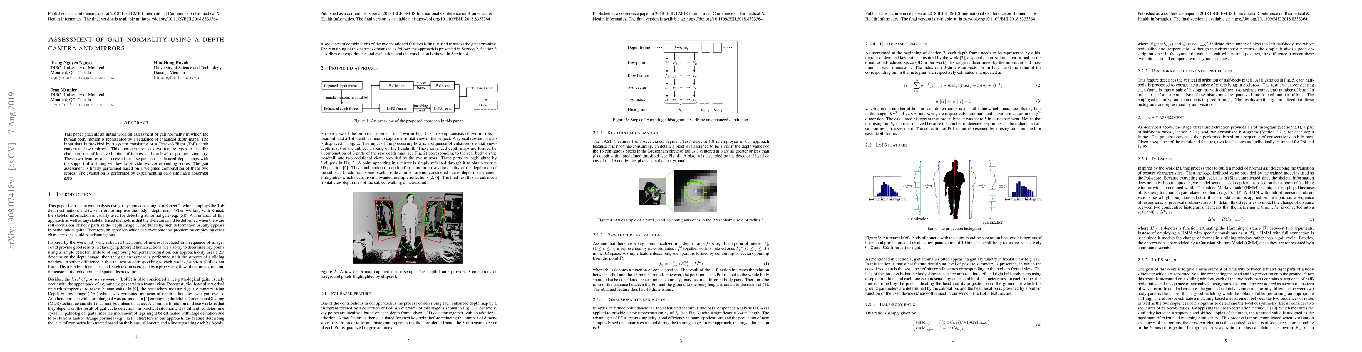 This paper proposes an assessment method for gait normality using a Time-of-Flight depth camera and mirrors, which generates enhanced depth maps to extract features describing localized points and posture symmetry, ultimately combining them to score gait normality. Experiments on simulated abnormal gaits validate the approach.