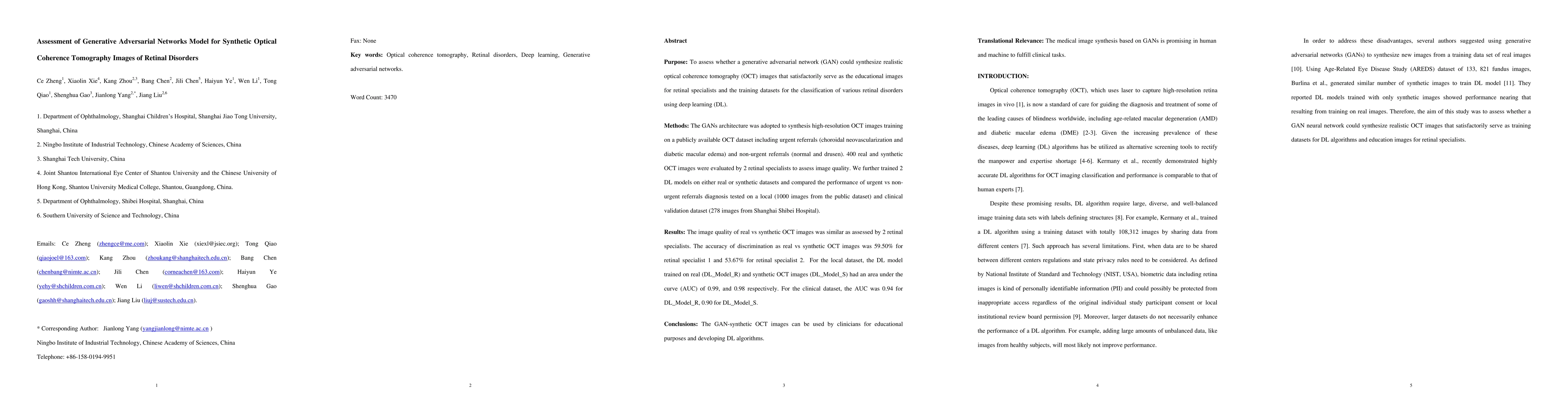 This study assesses the use of generative adversarial networks (GANs) to synthesize realistic OCT images for retinal disorders, finding similar image quality between real and synthetic images. The GAN-generated images support effective deep learning training for retinal disorder classification.