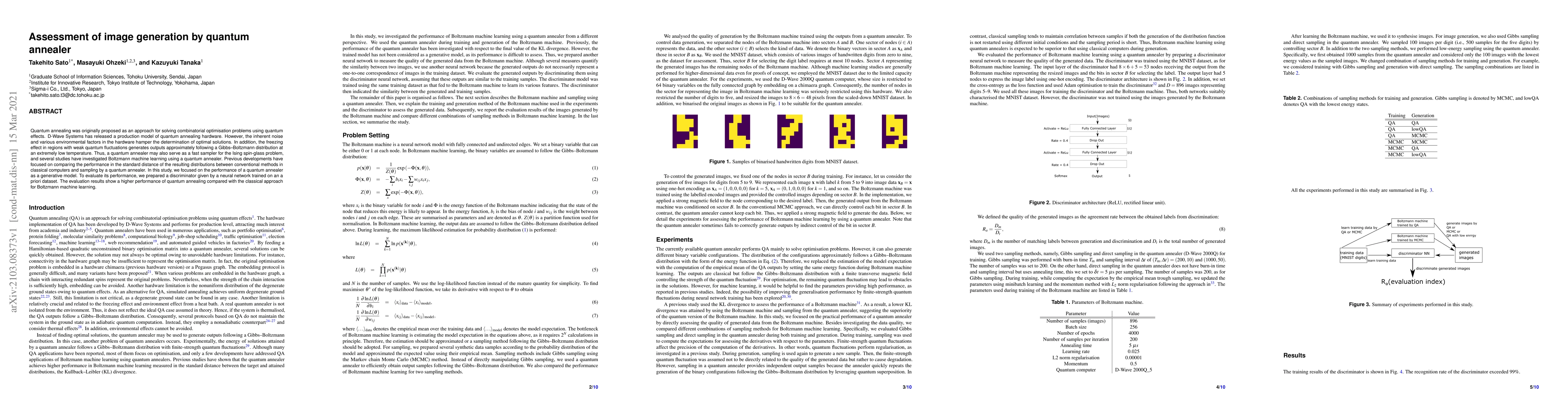 This paper assesses the performance of a quantum annealer as a generative model for image generation, employing a neural network discriminator trained on an a priori dataset. The results indicate that quantum annealing outperforms classical methods for Boltzmann machine learning.